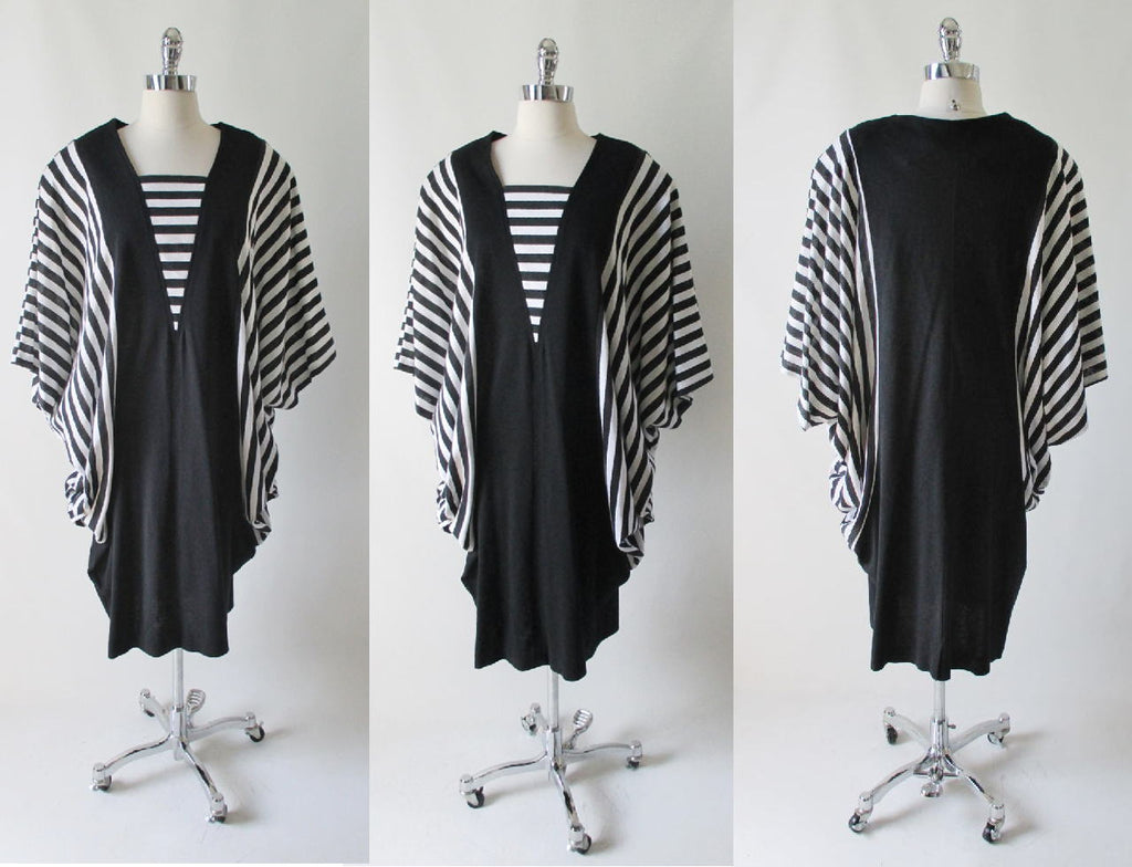 A unique vintage dress from the 80's with big, black and white striped batwing sleeves.