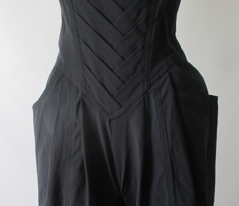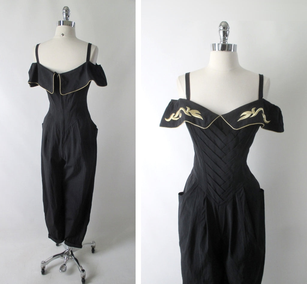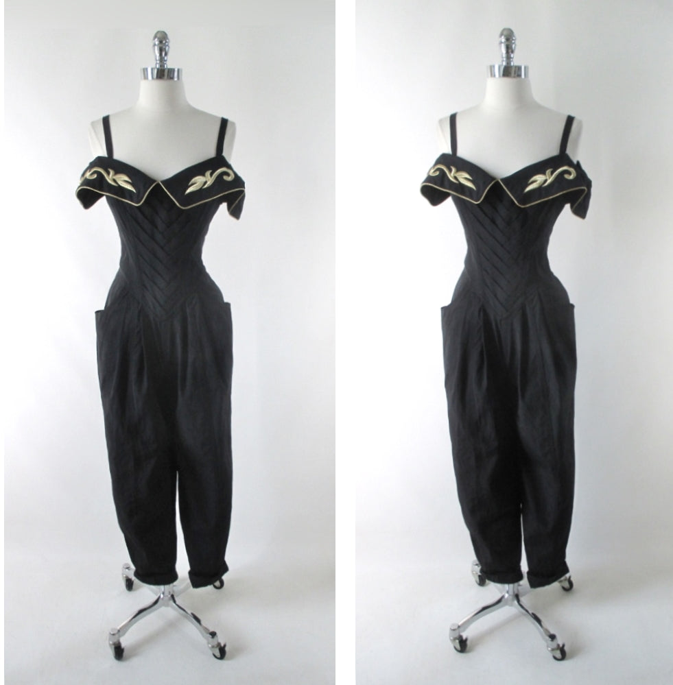 • Vintage 80s Karen Alexander Black & Gold Trim Sweetheart Jumpsuit M