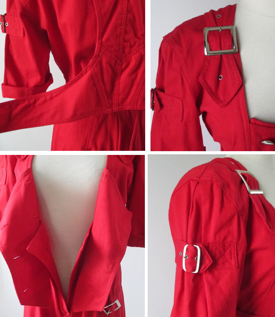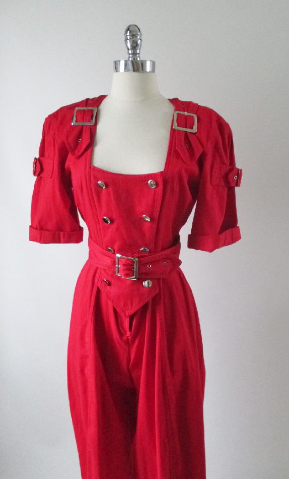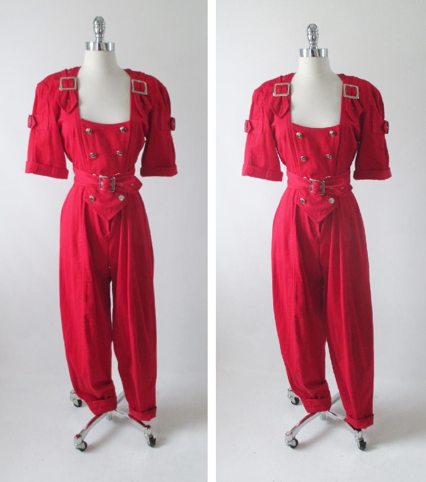 • Vintage 80's Karen Alexander Red Buckles & Buttons Jumpsuit M