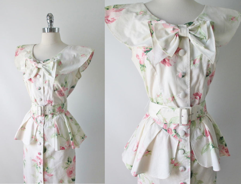 • Vintage 80's Pink Garden Roses Peplum Dress M