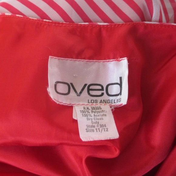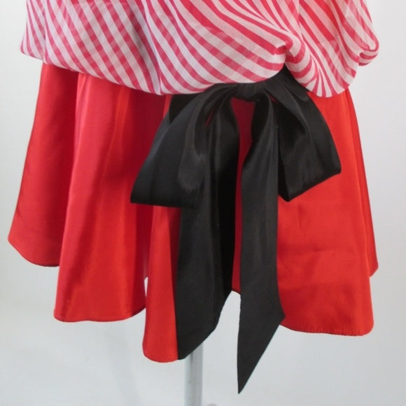 Spaghetti strap, tank style with sheer, striped overlay over red taffeta