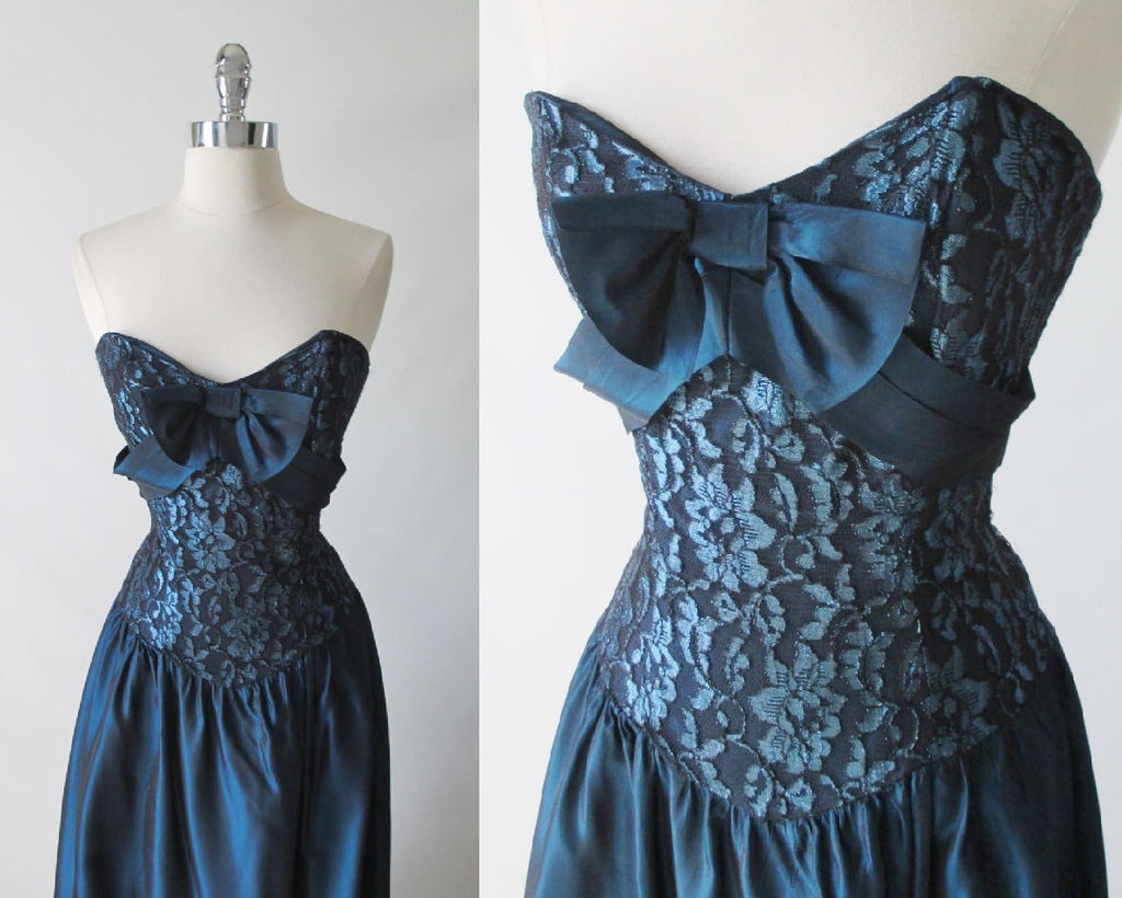 • Vintage 80's Sweetheart Blue Sharkskin Taffeta Lace Party Dress