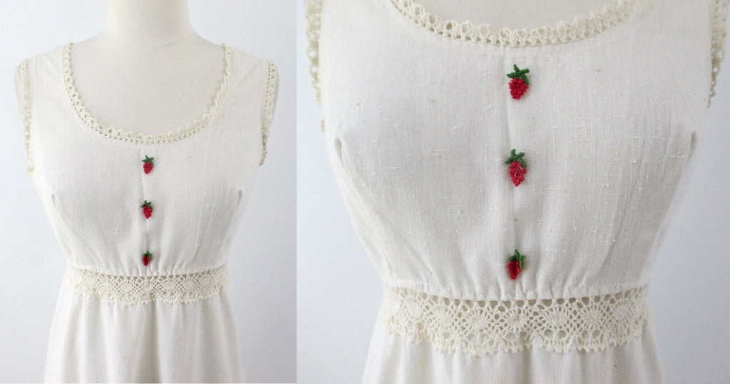 Center of the bodice is accented with three red strawberries.
