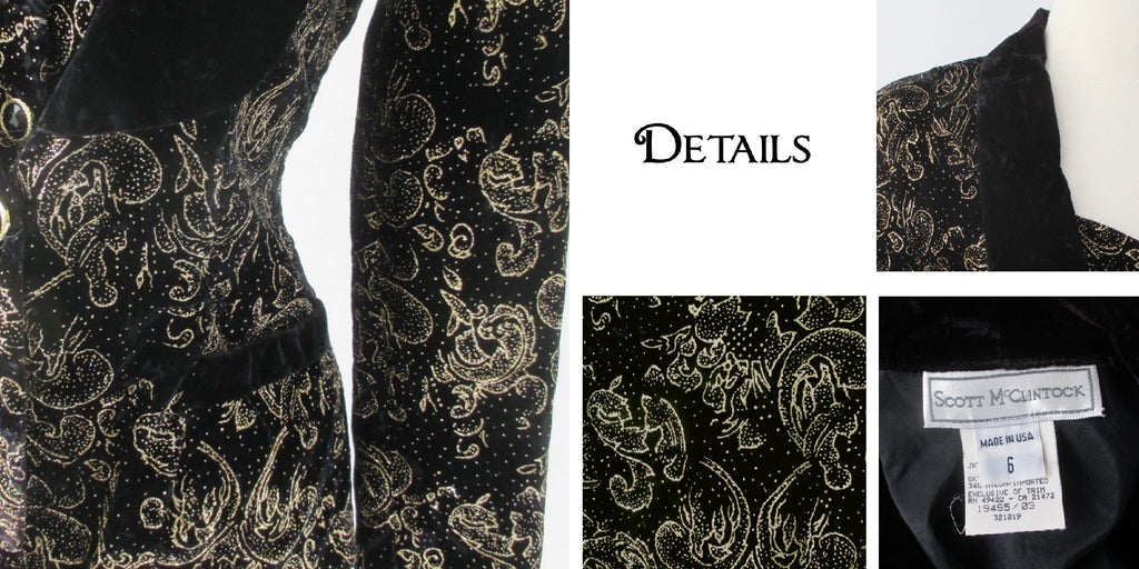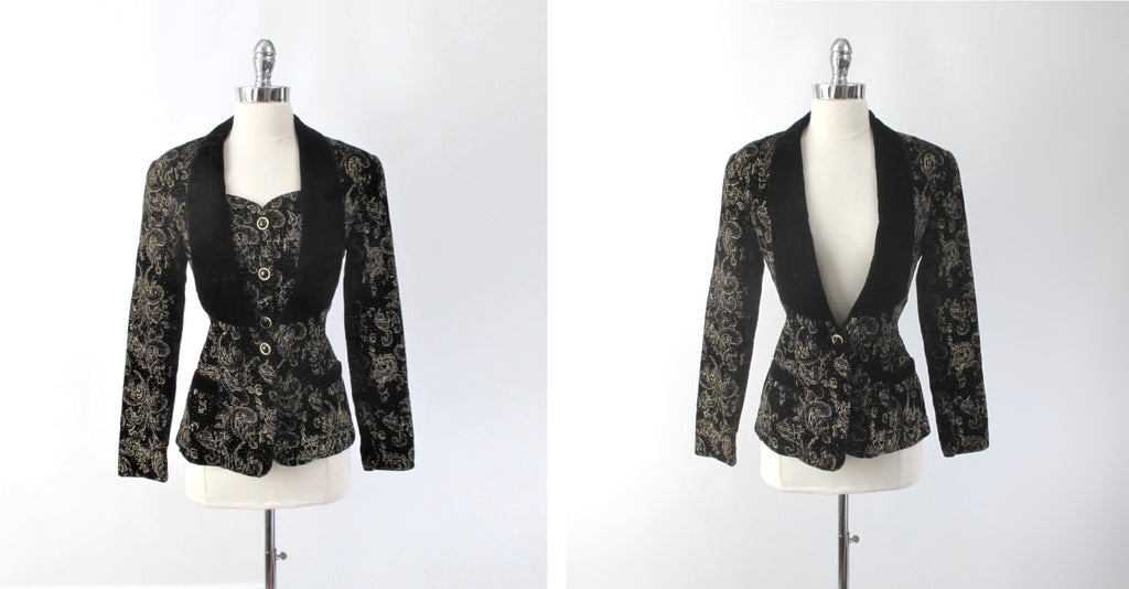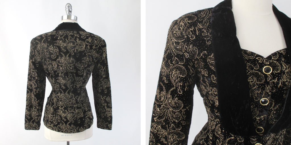 Vintage 80s 90s Gold Flocked Black Velvet Jacket Vest S
