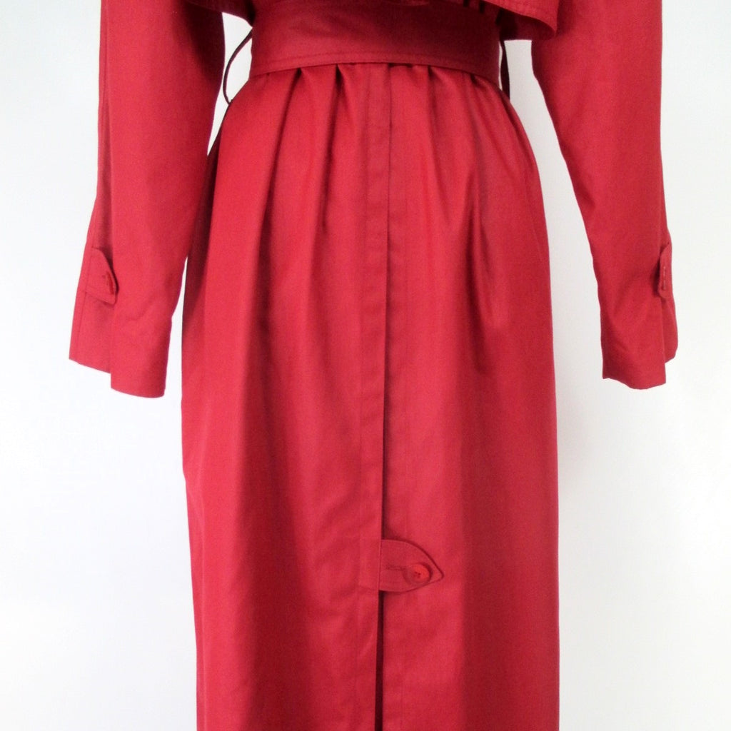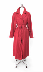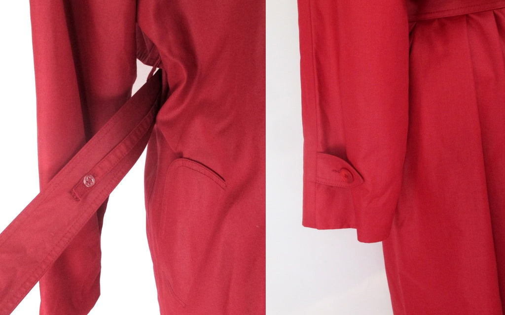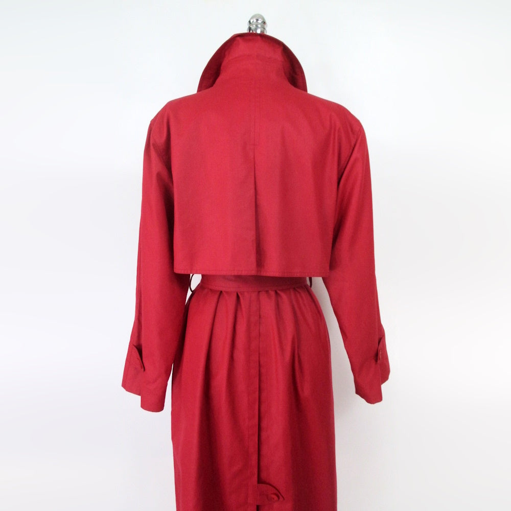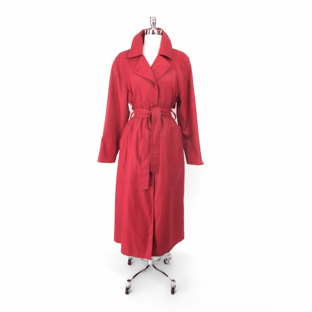 A vintage red trench coat by London Fog, from the 1980's to 90's.