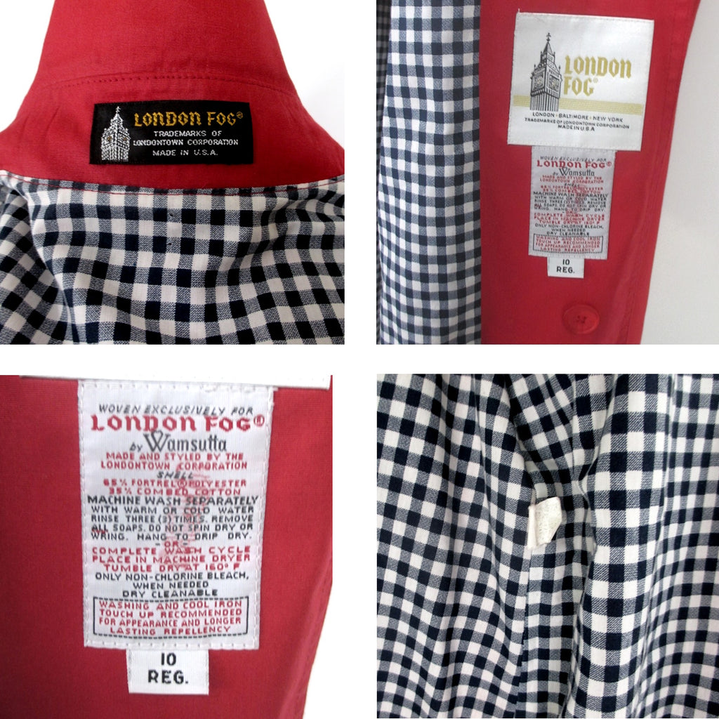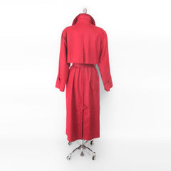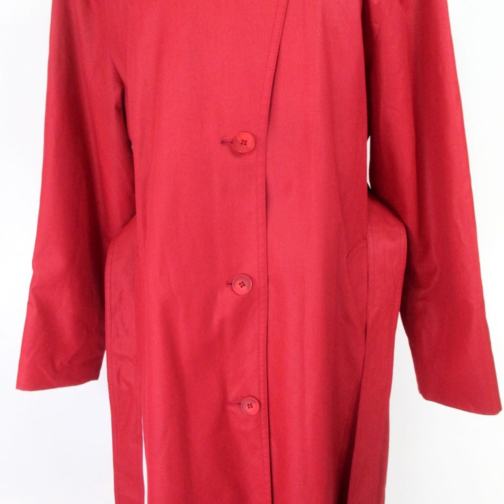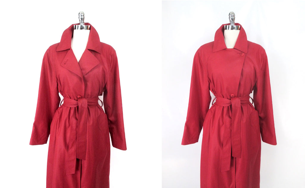 A vintage red trench coat by London Fog, from the 1980's to 90's.