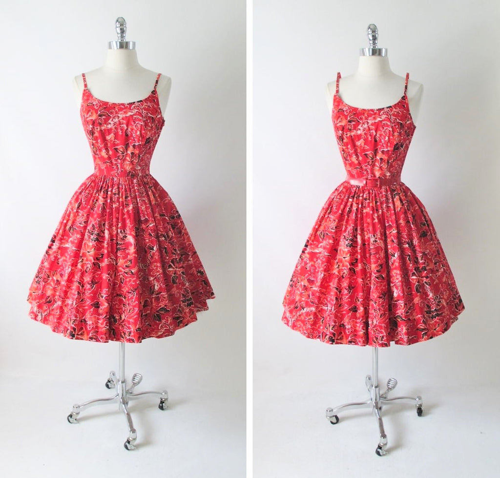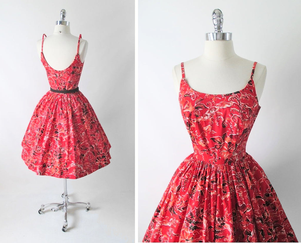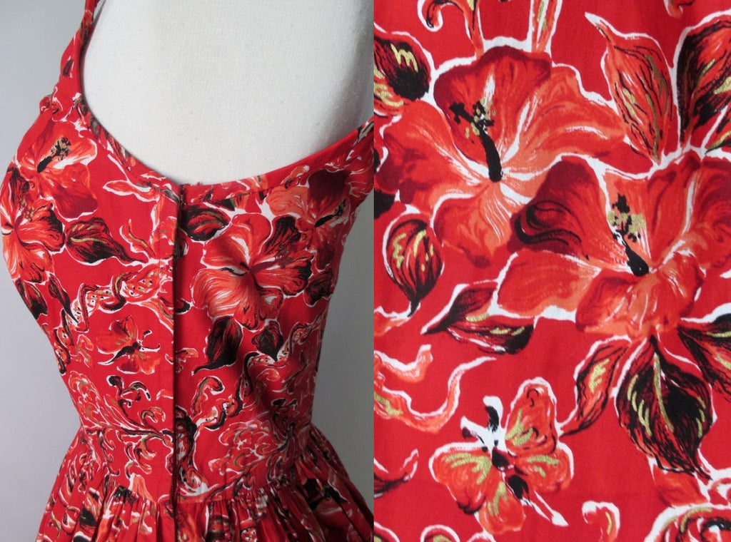 Vintage 50's Surfriders Red Flower Butterfly Hawaiian Tiki Luau Full Skirt Dress XS
