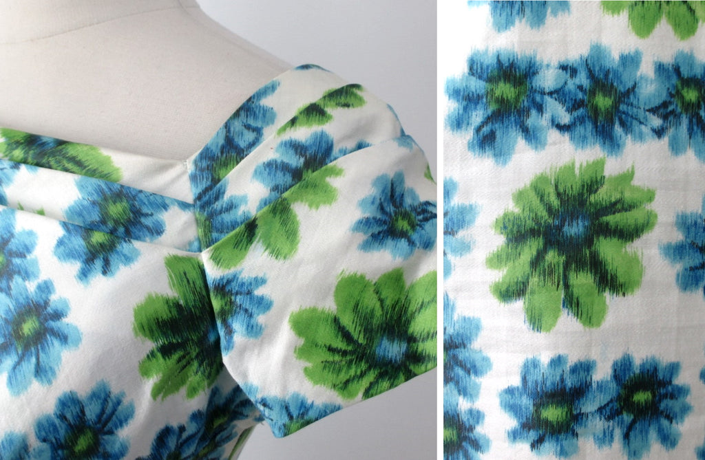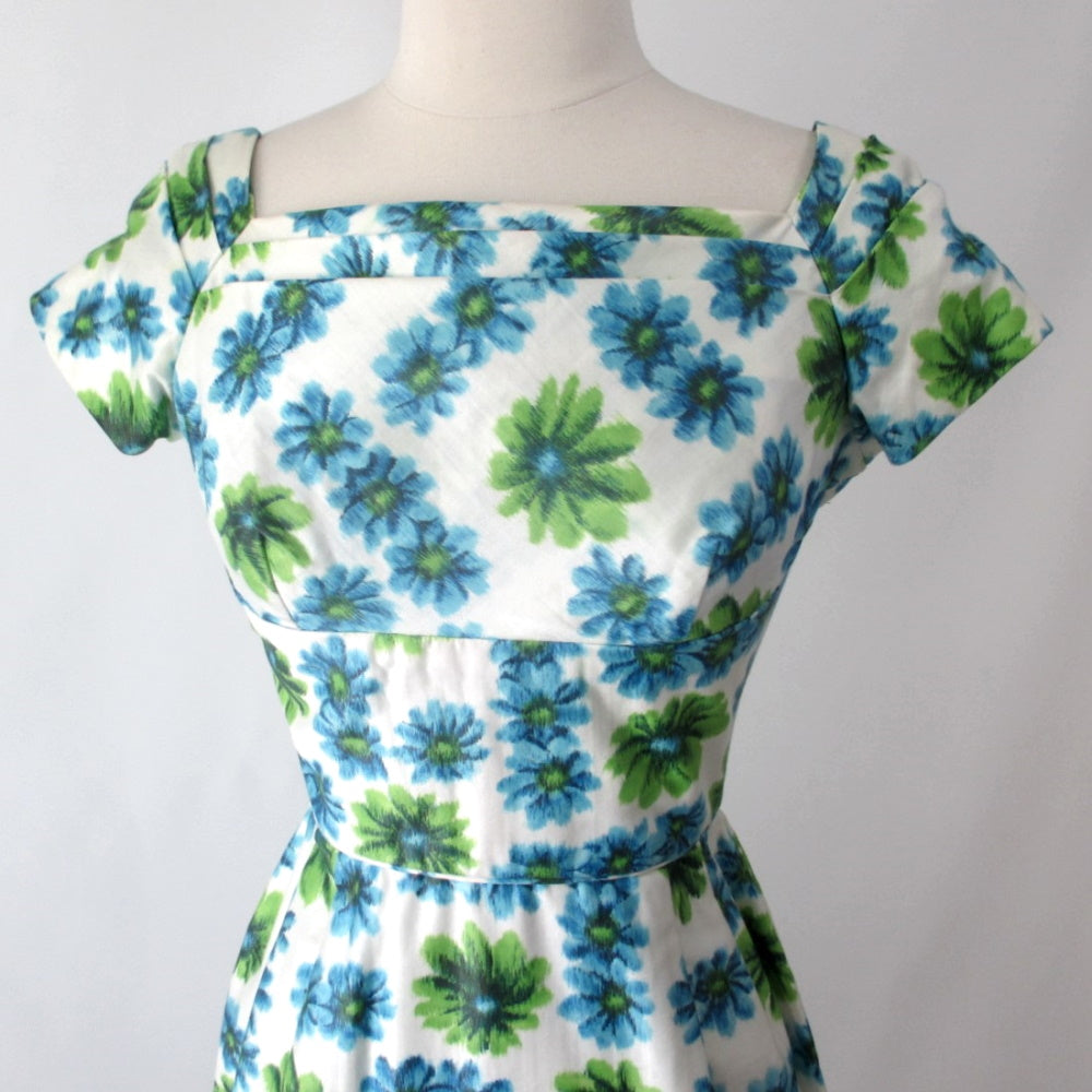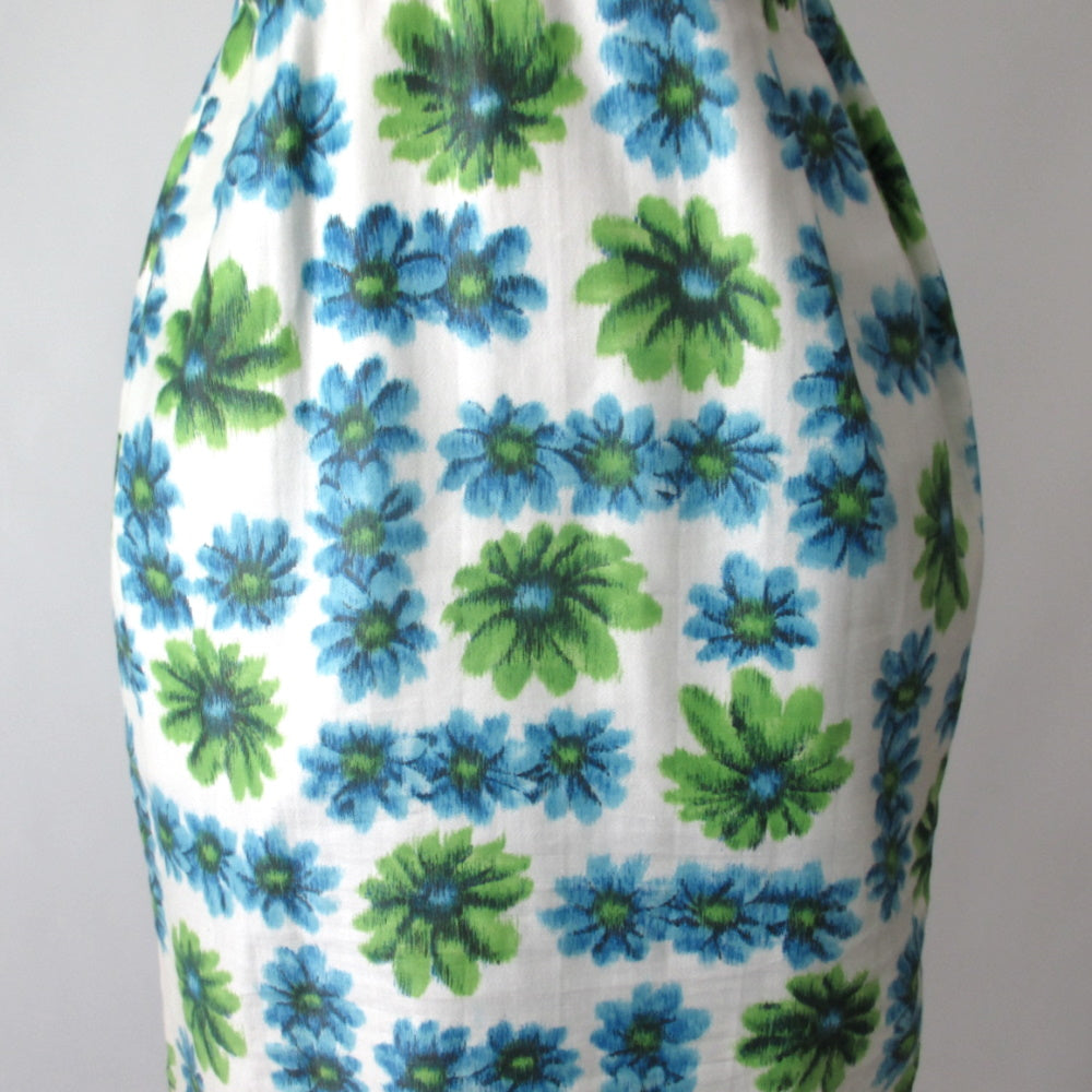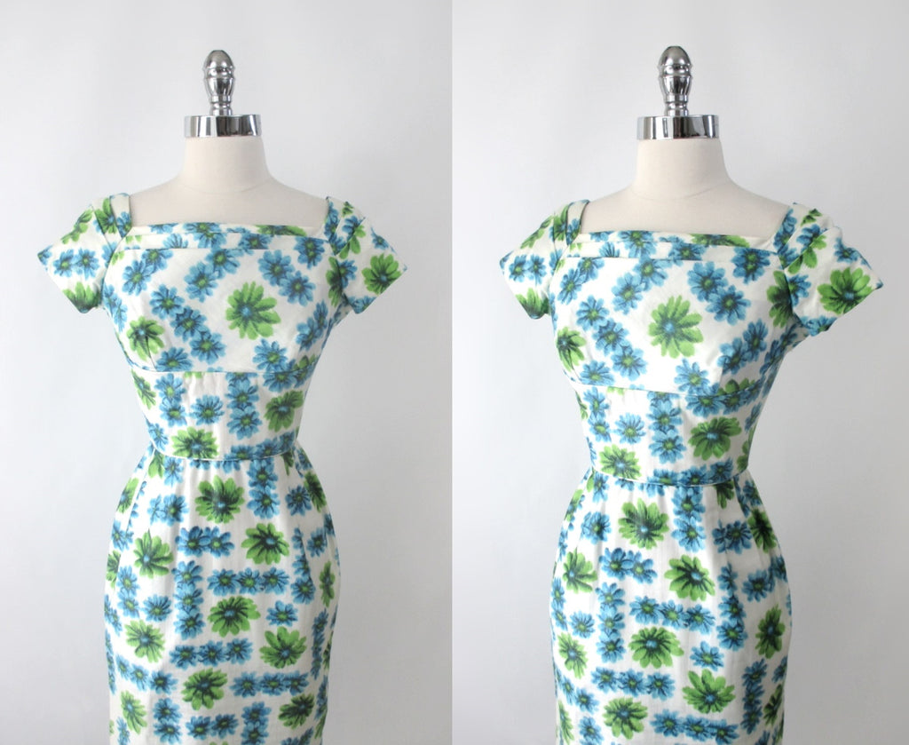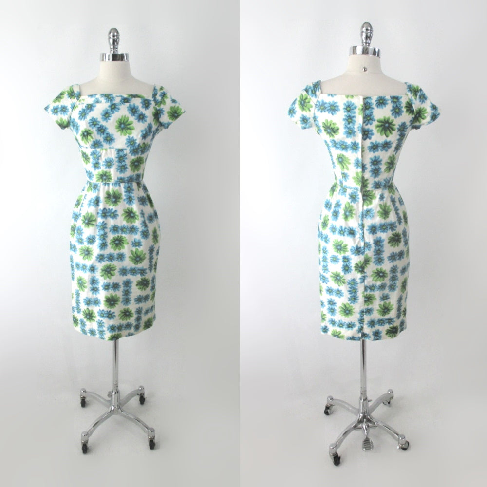 Vintage 50's Blue Green Floral Sheath Party Dress XS