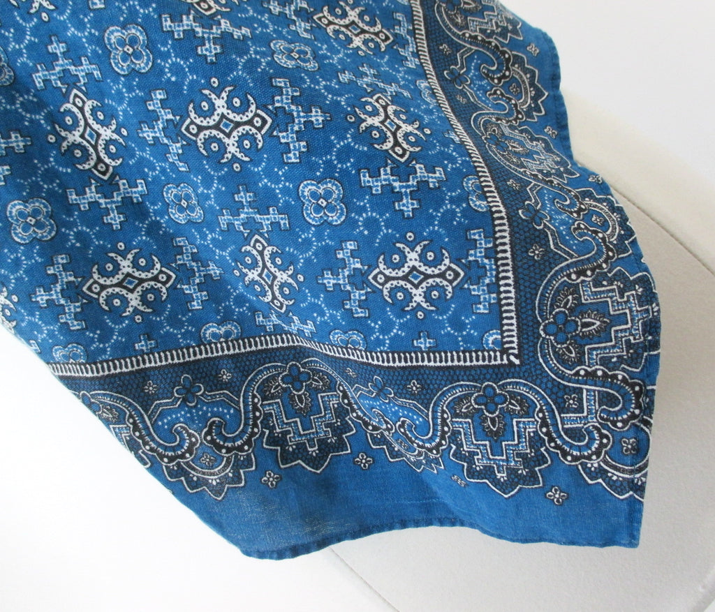Rich blue base with white and black paisley and floral print.