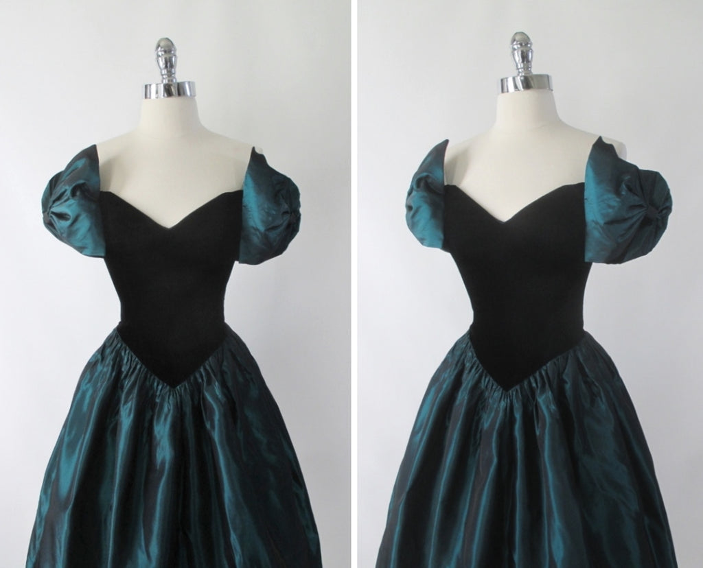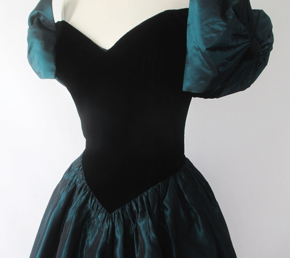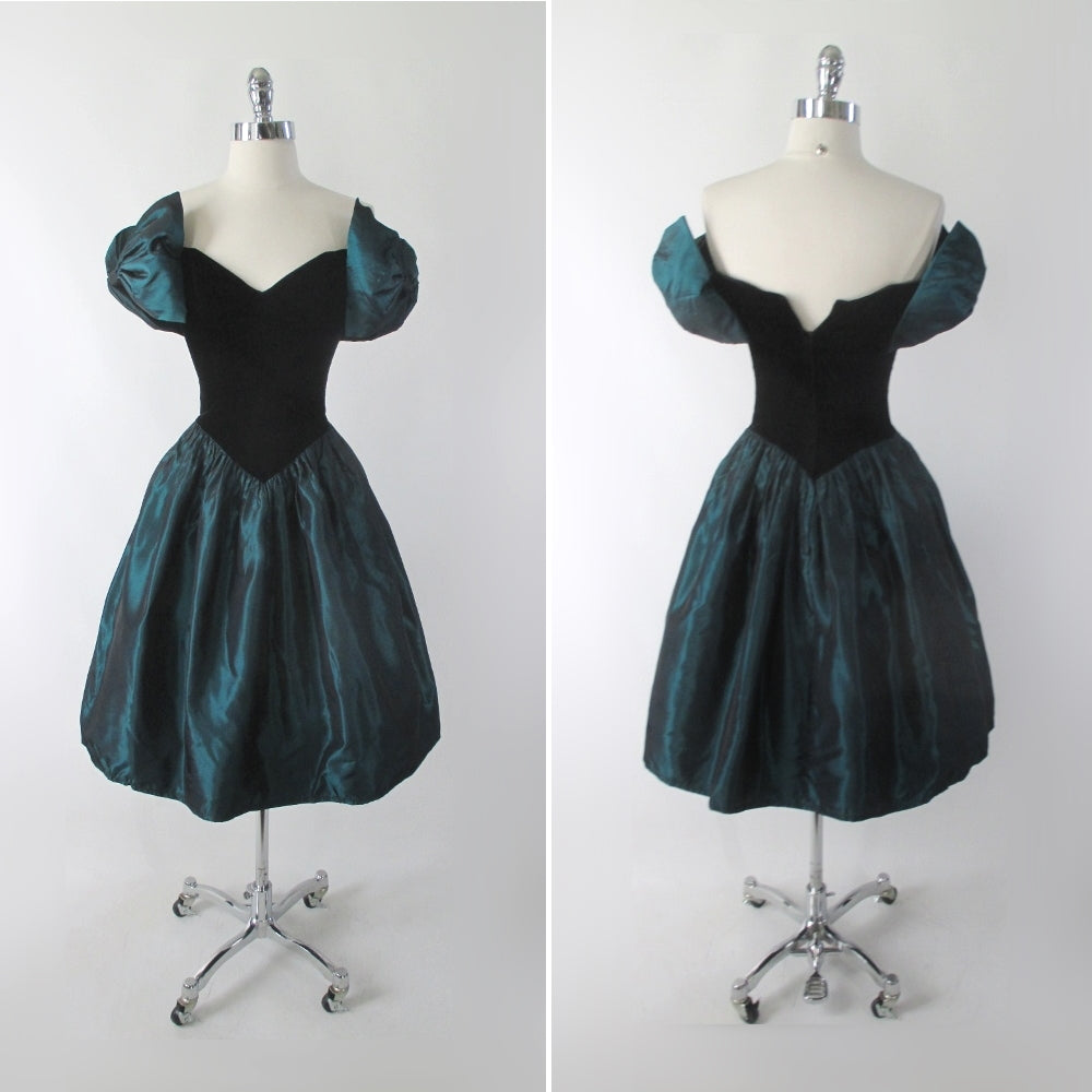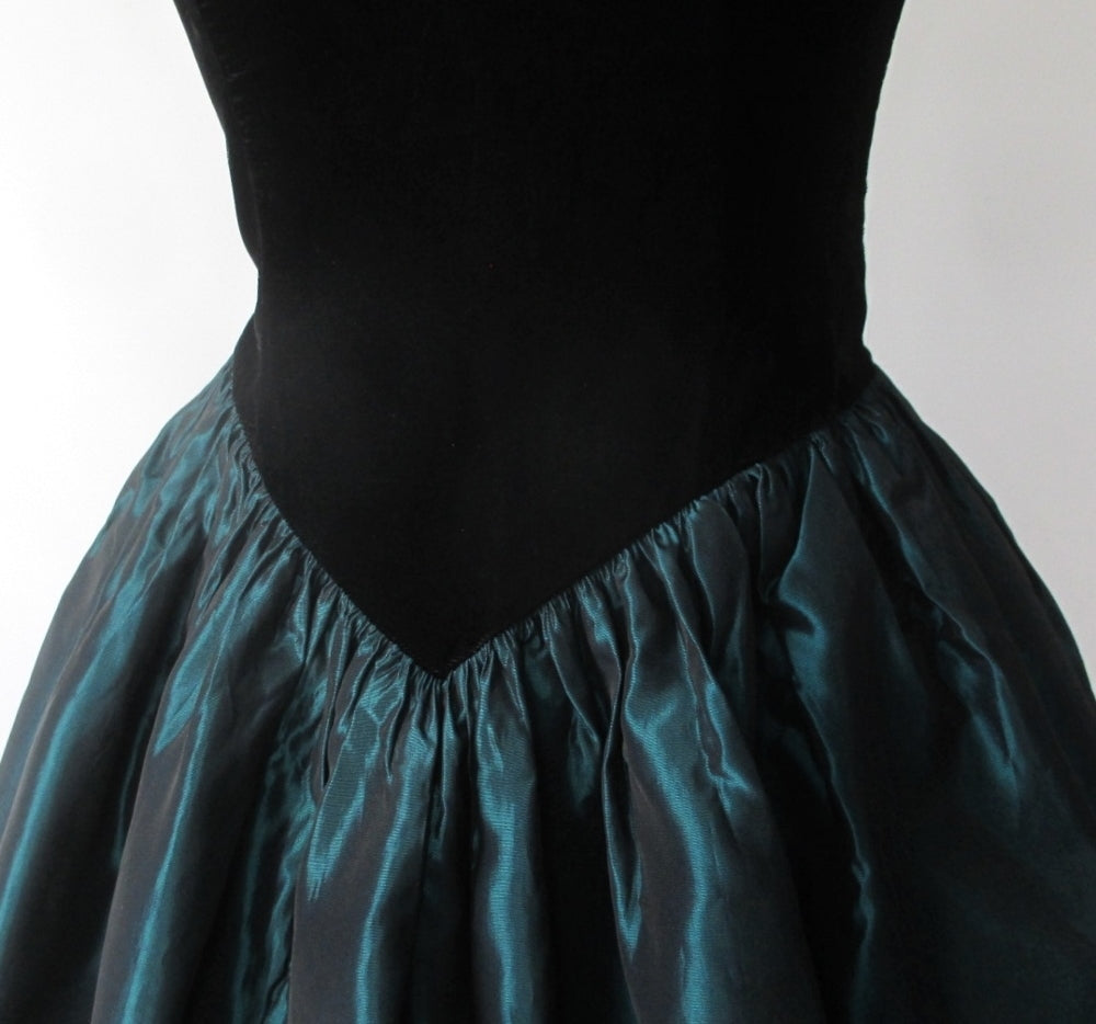 A cute vintage dress form the 1980's by Jessica McClintock for Gunne Sax in a pretty sharkskin taffeta and black.
