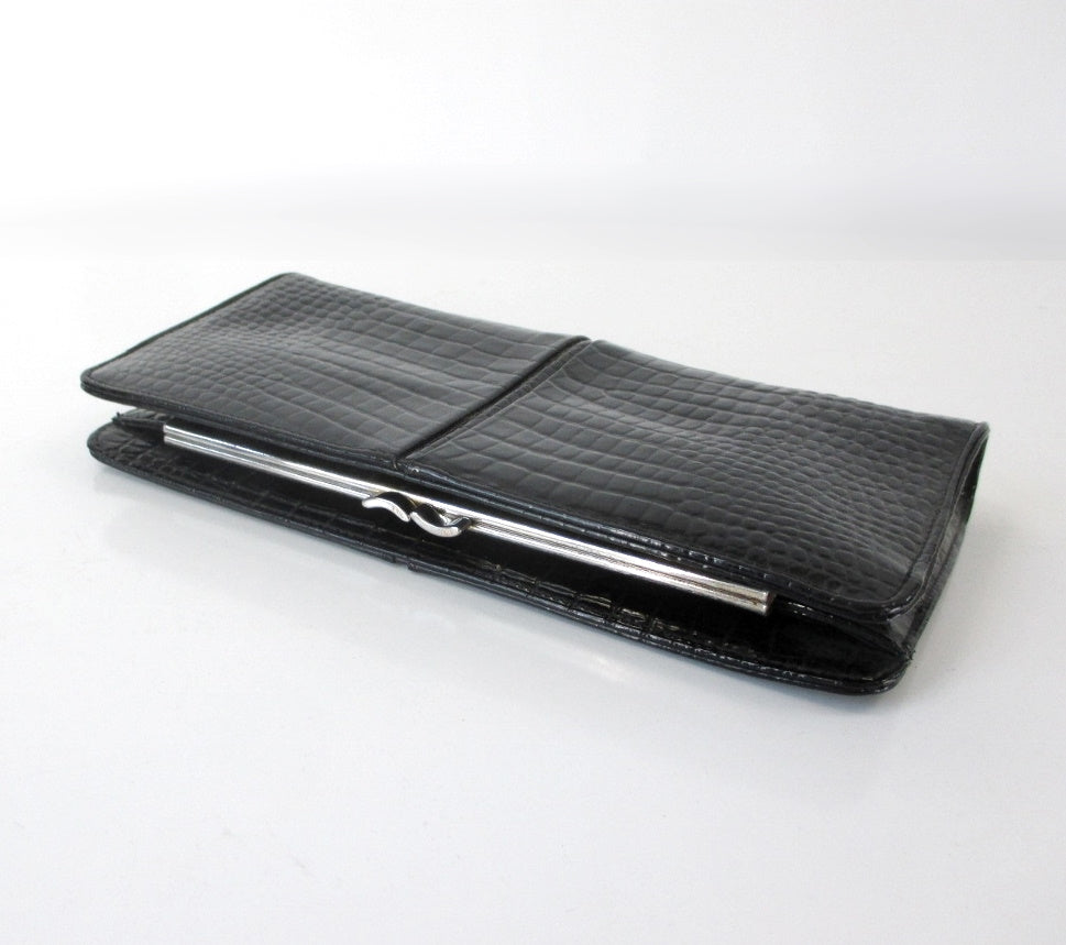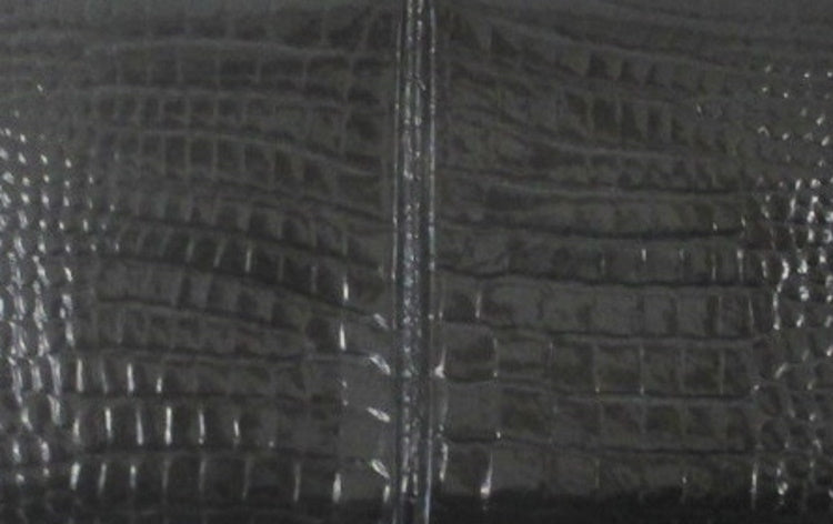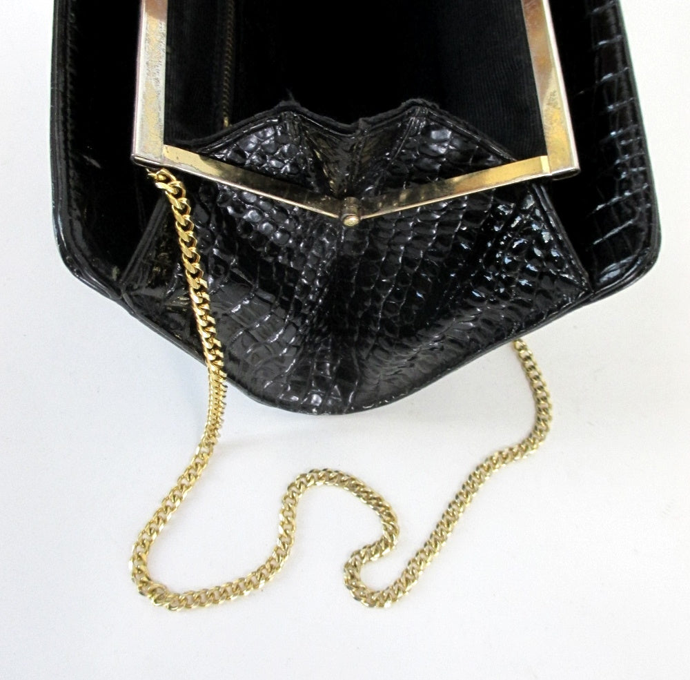 Black patent, embossed alligator clutch with center seam and hidden chain strap.
