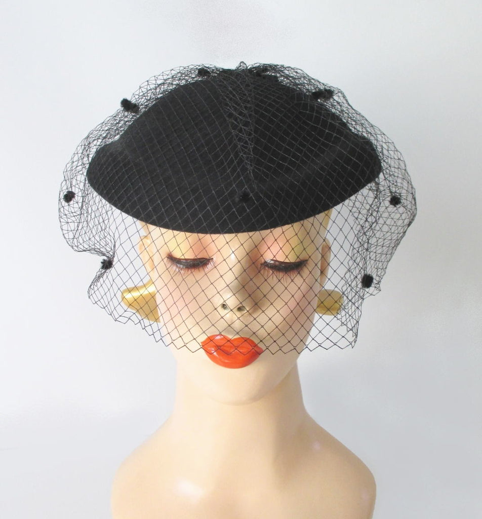 Vintage 40's Style Black Bow Veil Wool Hat