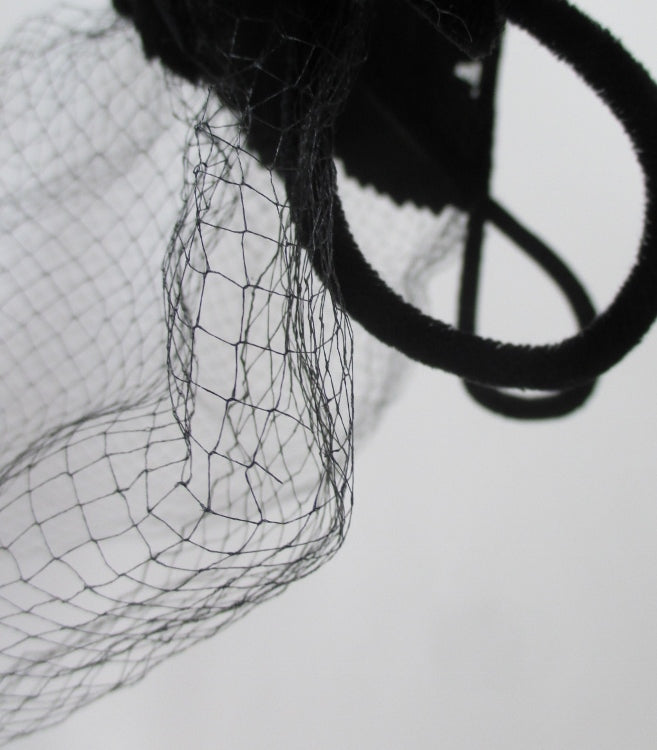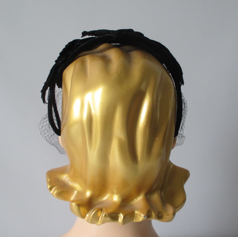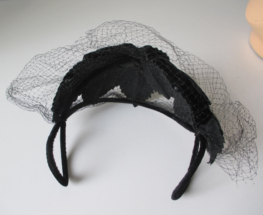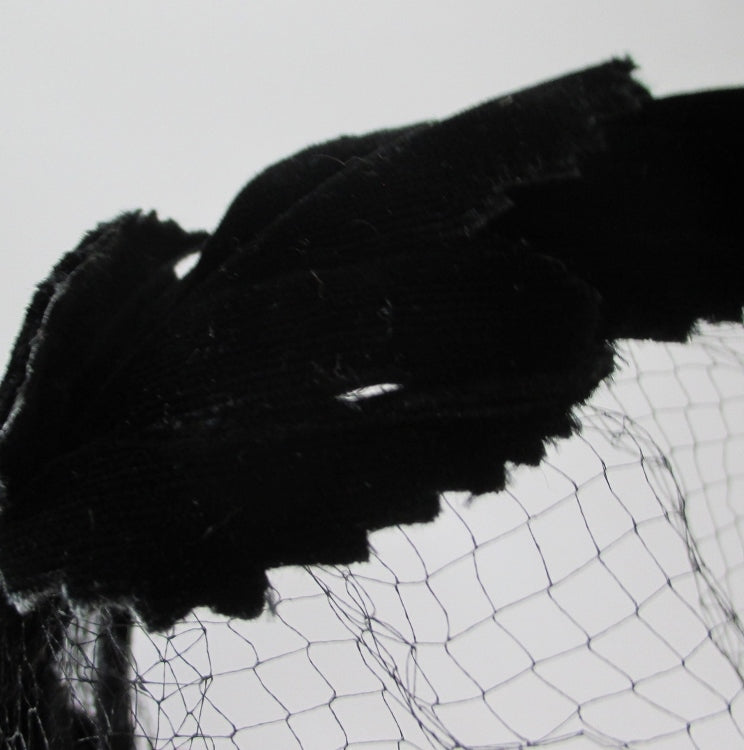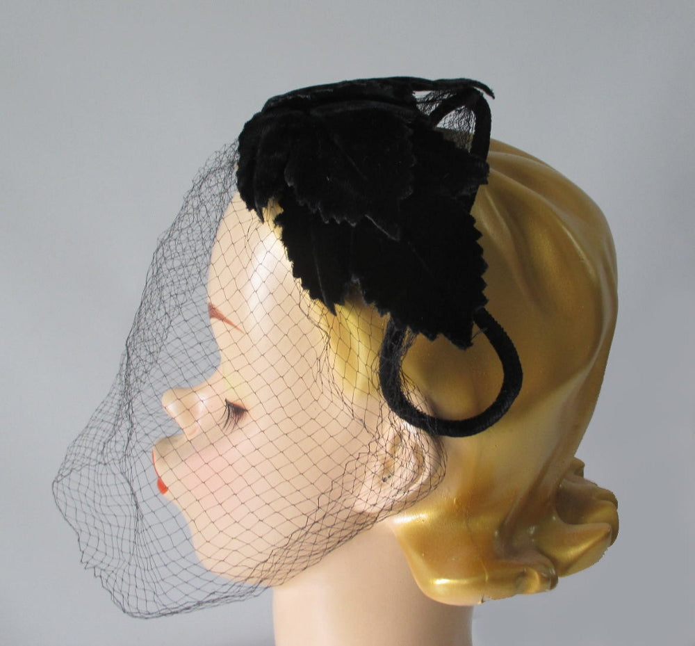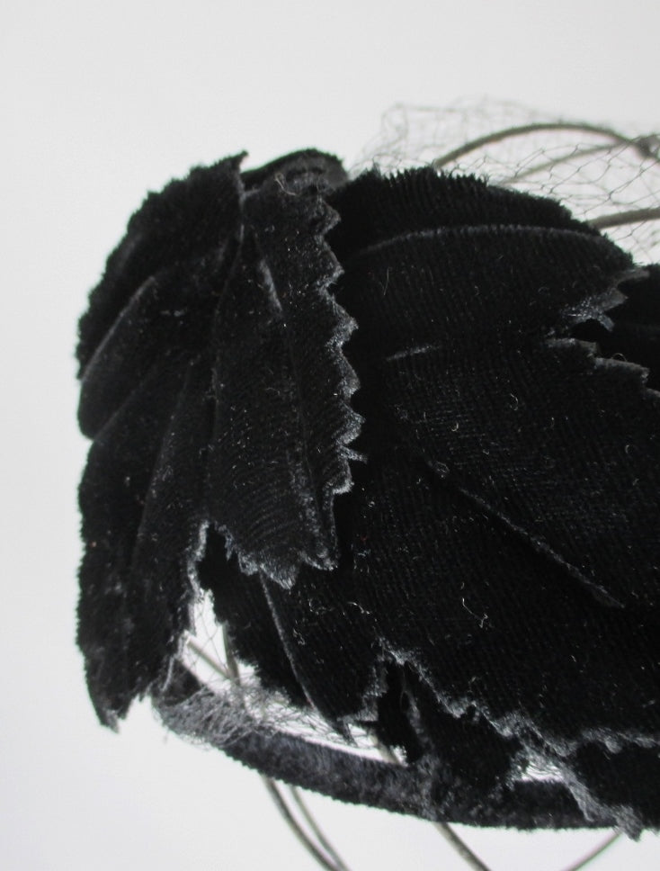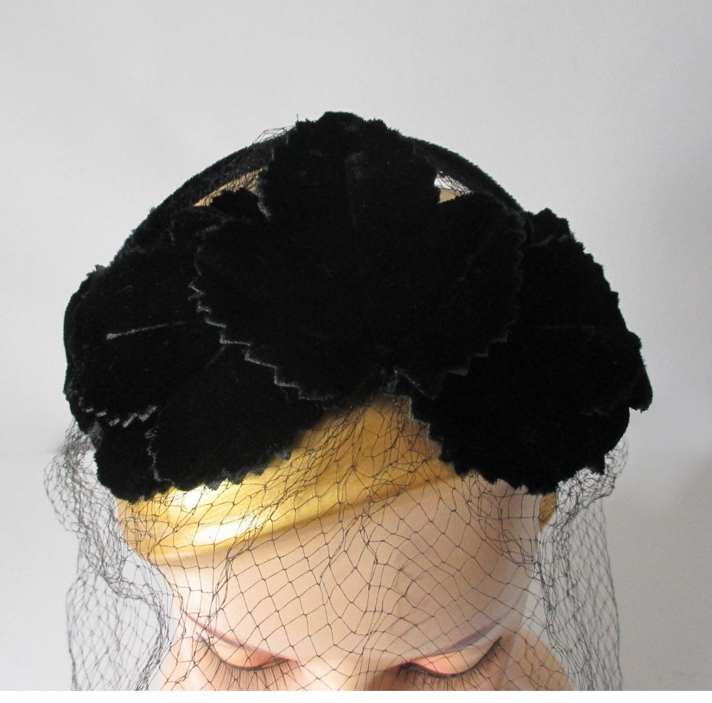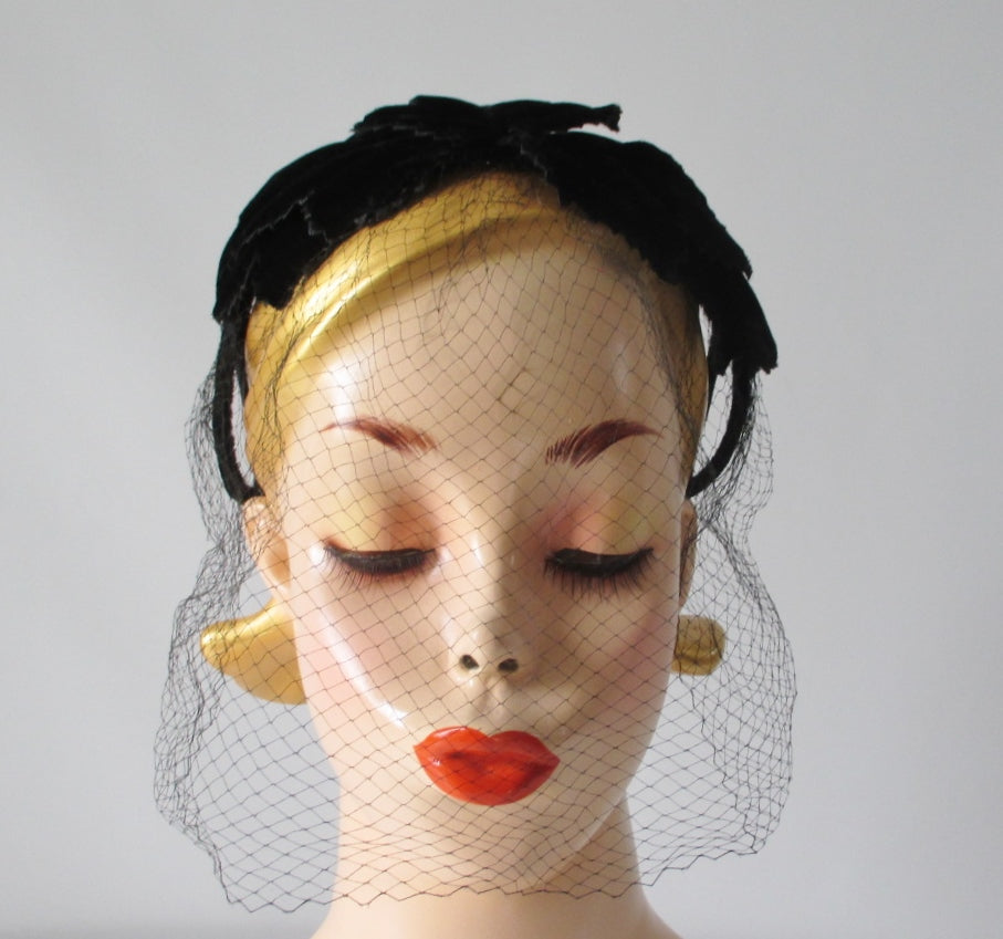 Vintage 50's Black Velvet Crown Cap Netted Veil Hat
