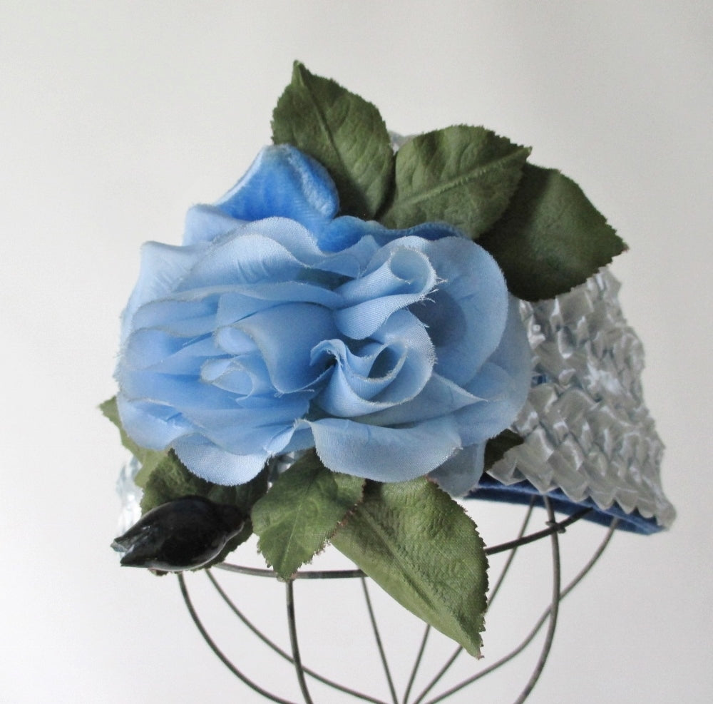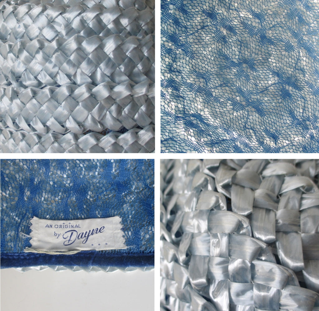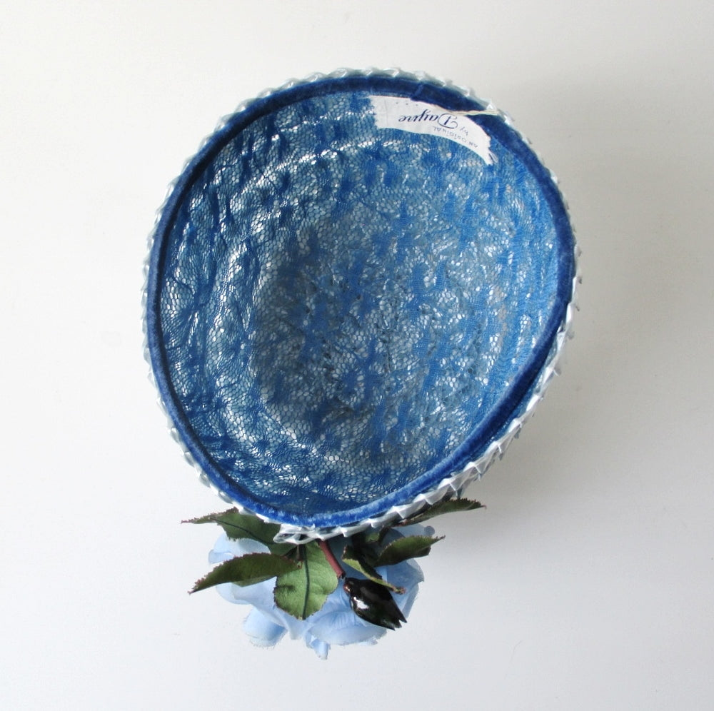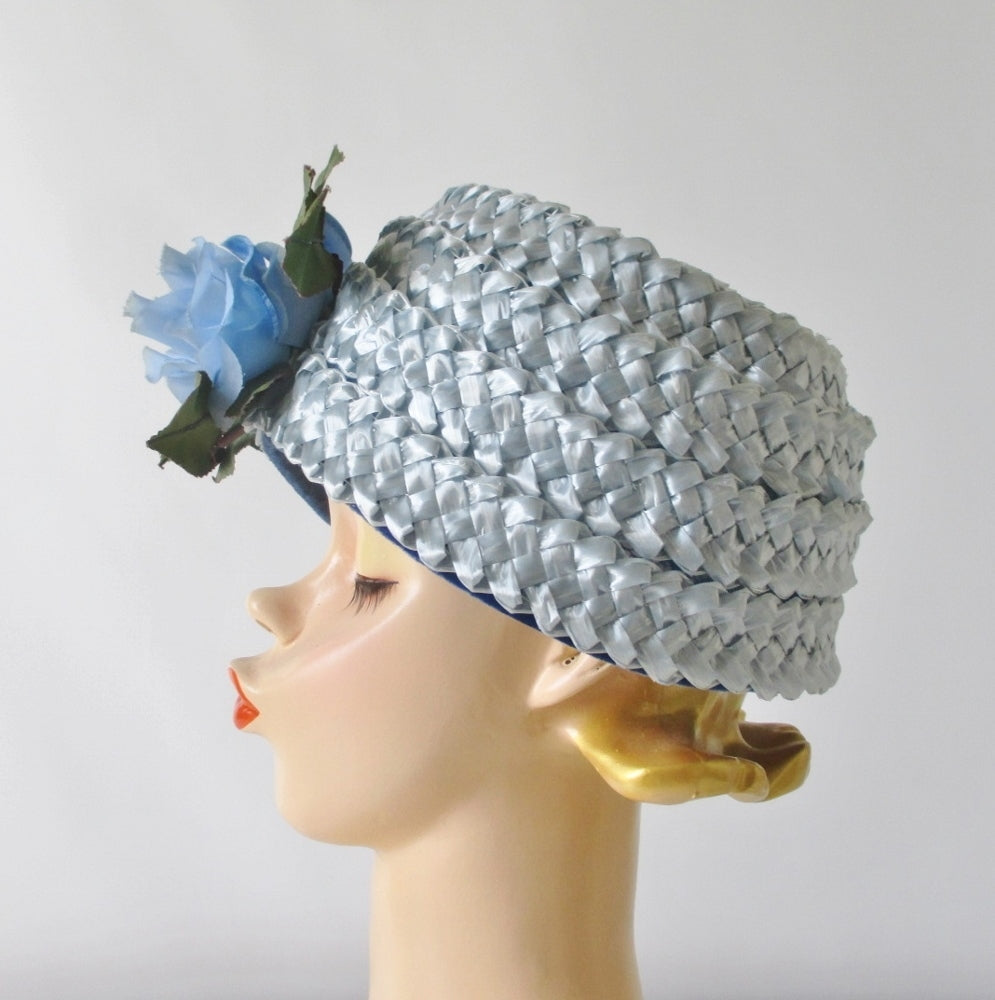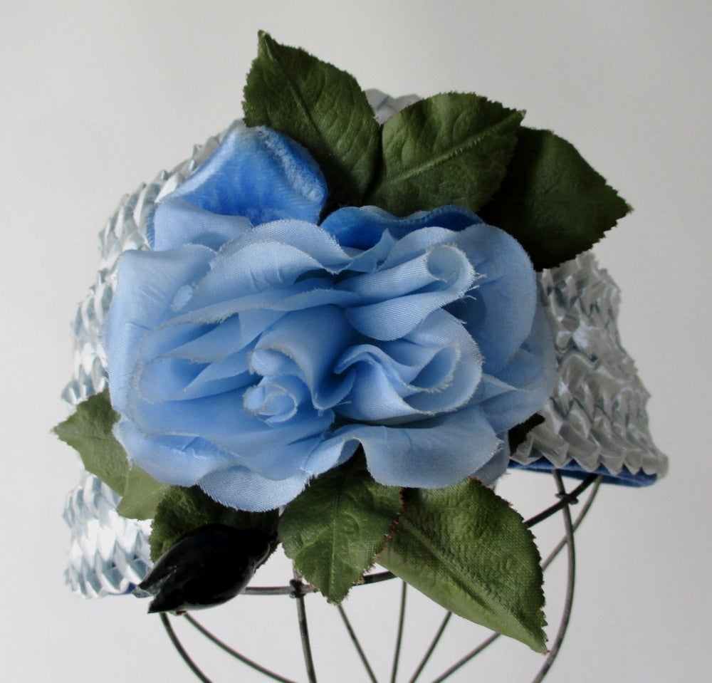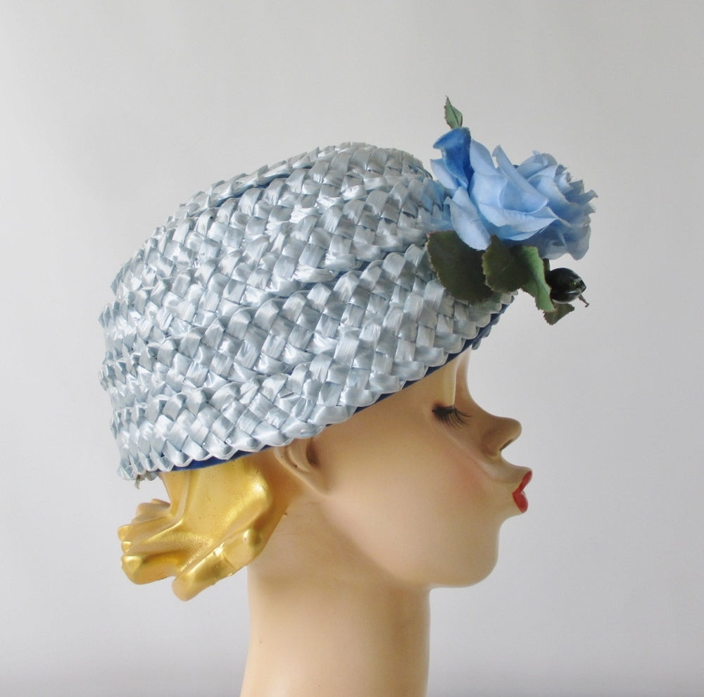 Vintage 60s Light Blue Rose Straw Bucket Hat