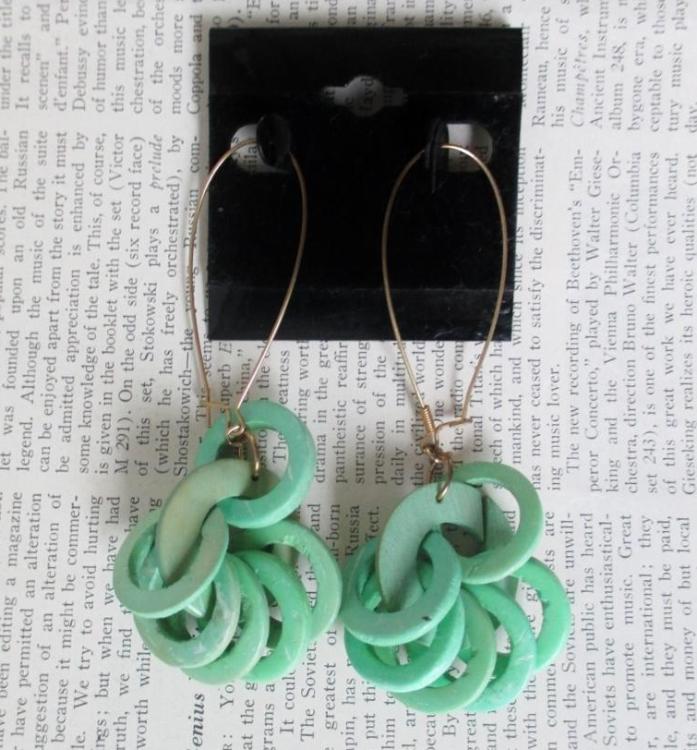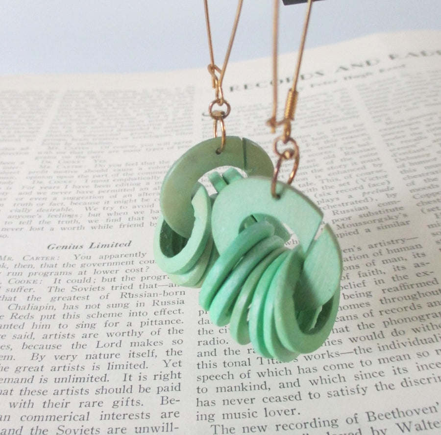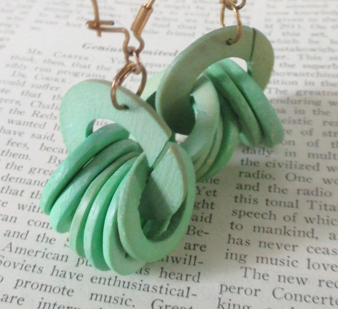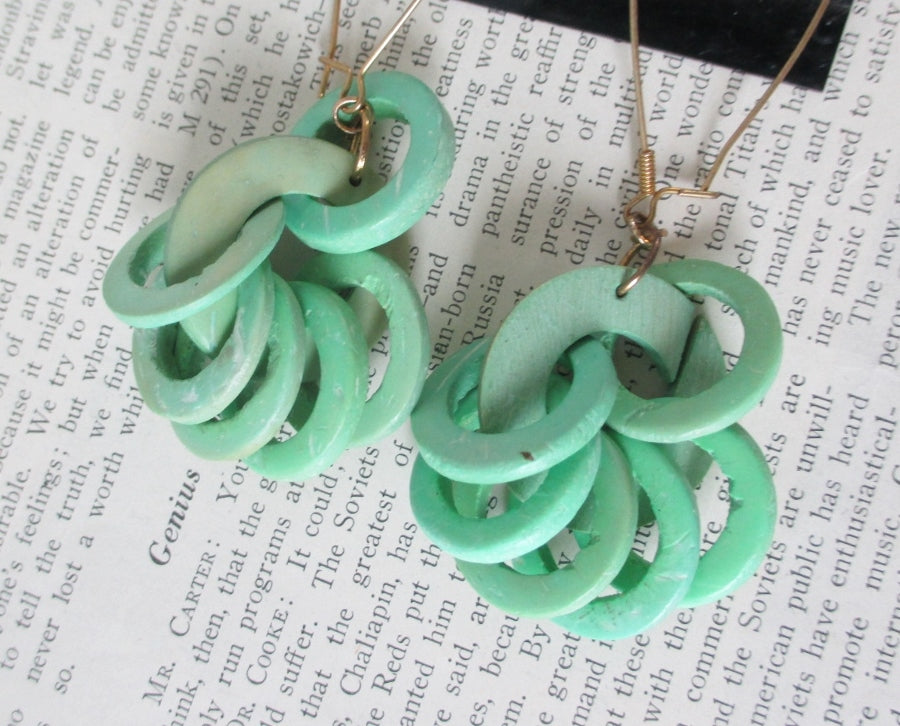 Green wooden rings gathered on one larger ring, that dangle on metal wire hoops.