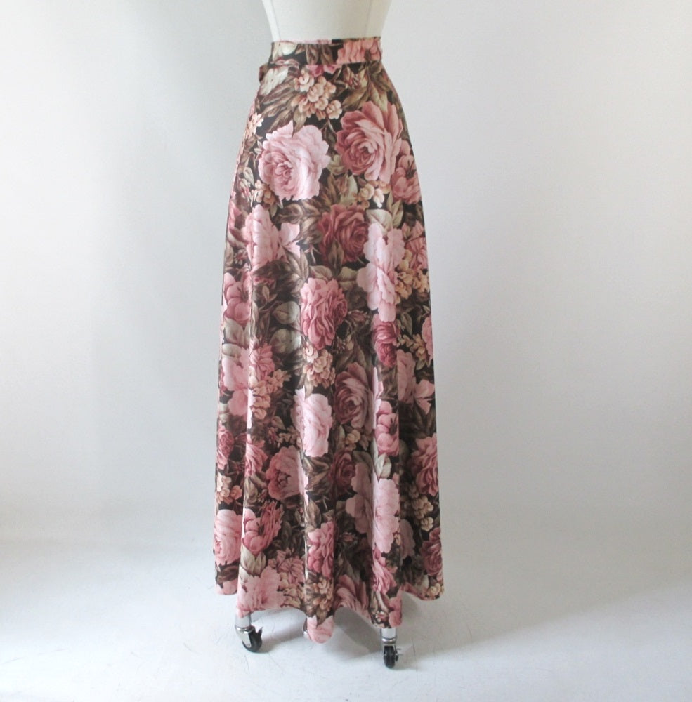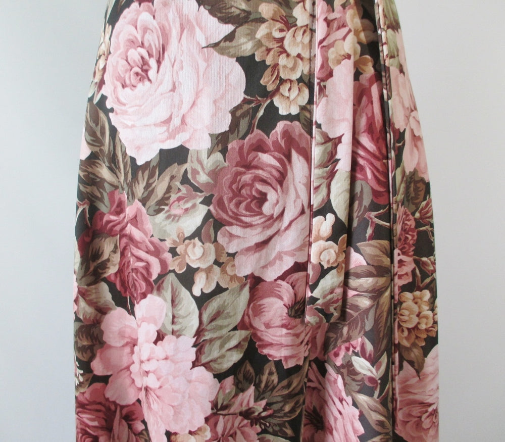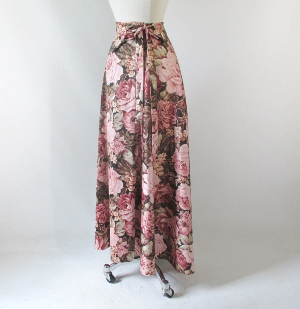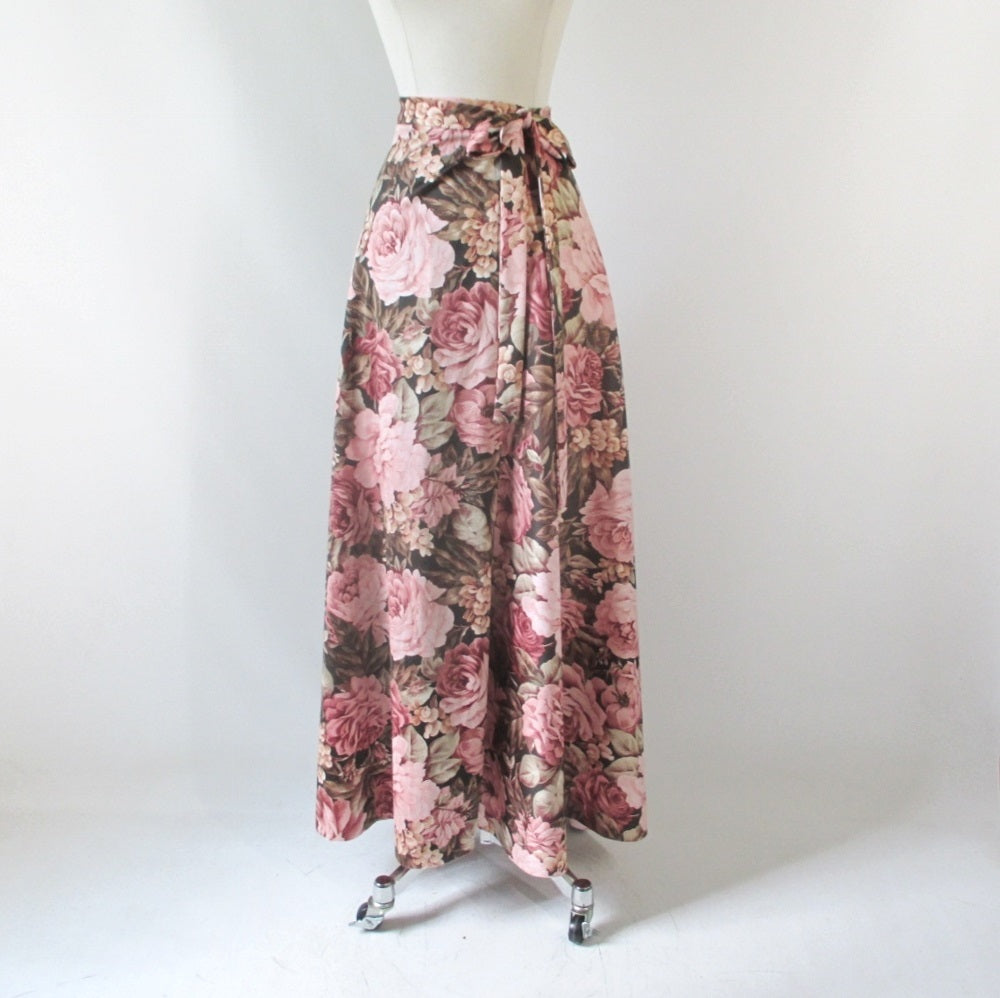 Vintage 70's Wrap Around Pink Roses Maxi Skirt L / M