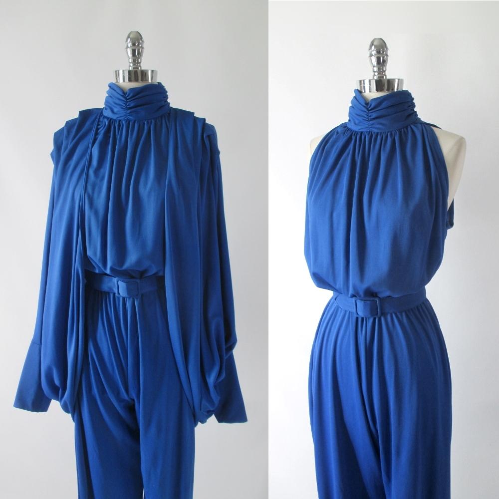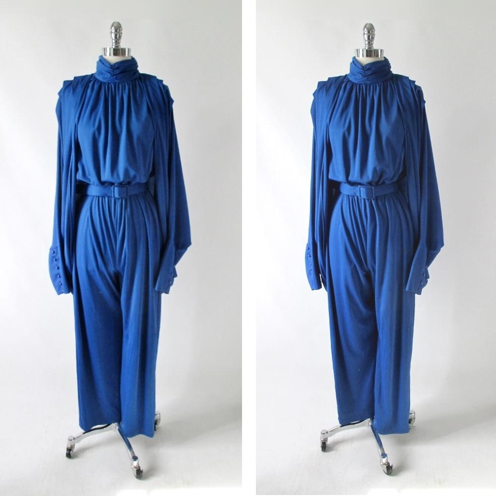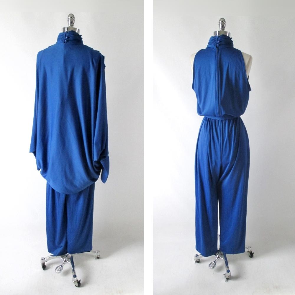 Vintage 80s Blue Jumpsuit Matching Batwing Cocoon Wrap L