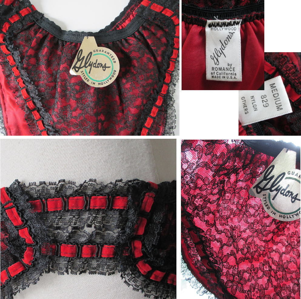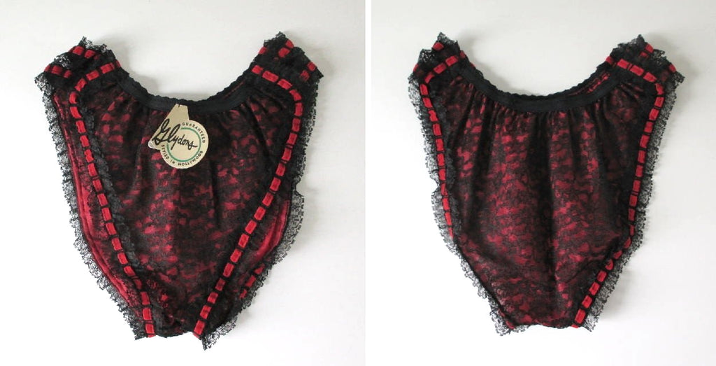 A vintage pair of panties from the 1950's to 60's by Glydons Full coverage black lace lined in red + Higher cut Edged with red velvet ribbon and lace ruffle Peek a boo lace sides with 2 rows of lace Marked a size medium + Nylon + Made in the USA Designer / Label : Glydons Fabric: Nylon • Size is marked a medium- fits approx. size medium • My dress form measures: • 33 1/2 Bust •23 Waist •34 Hips
