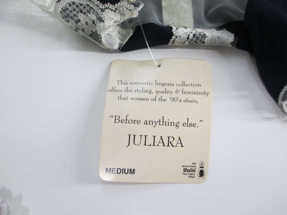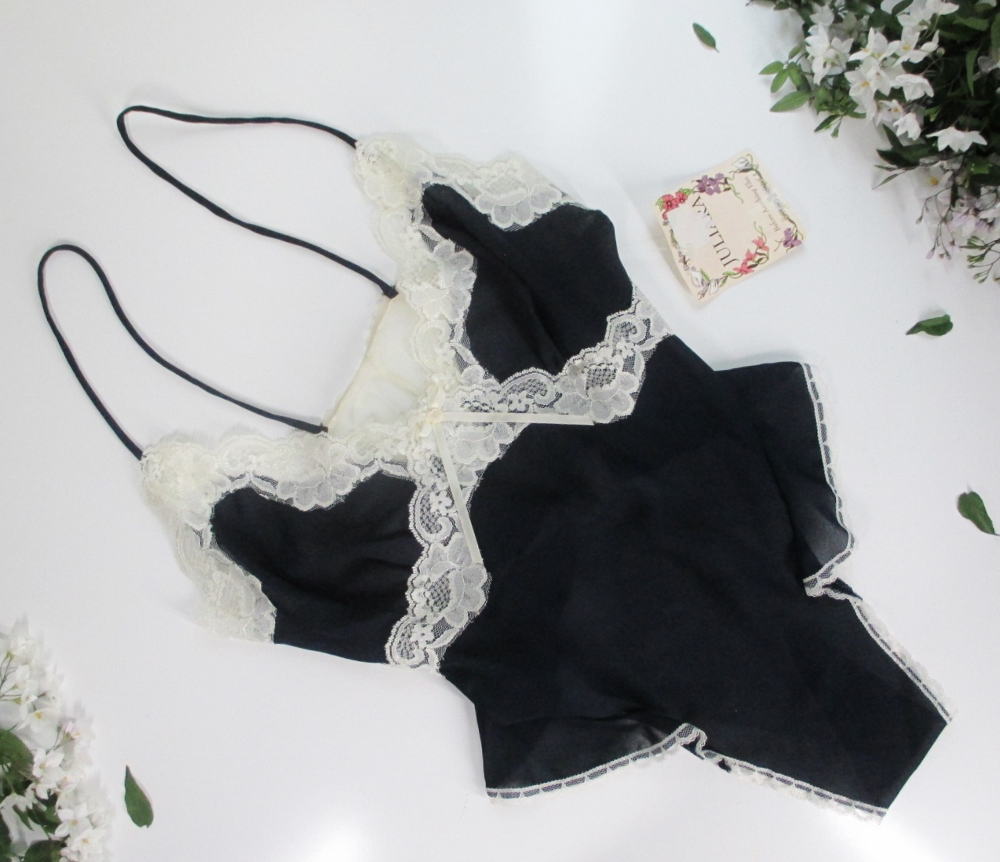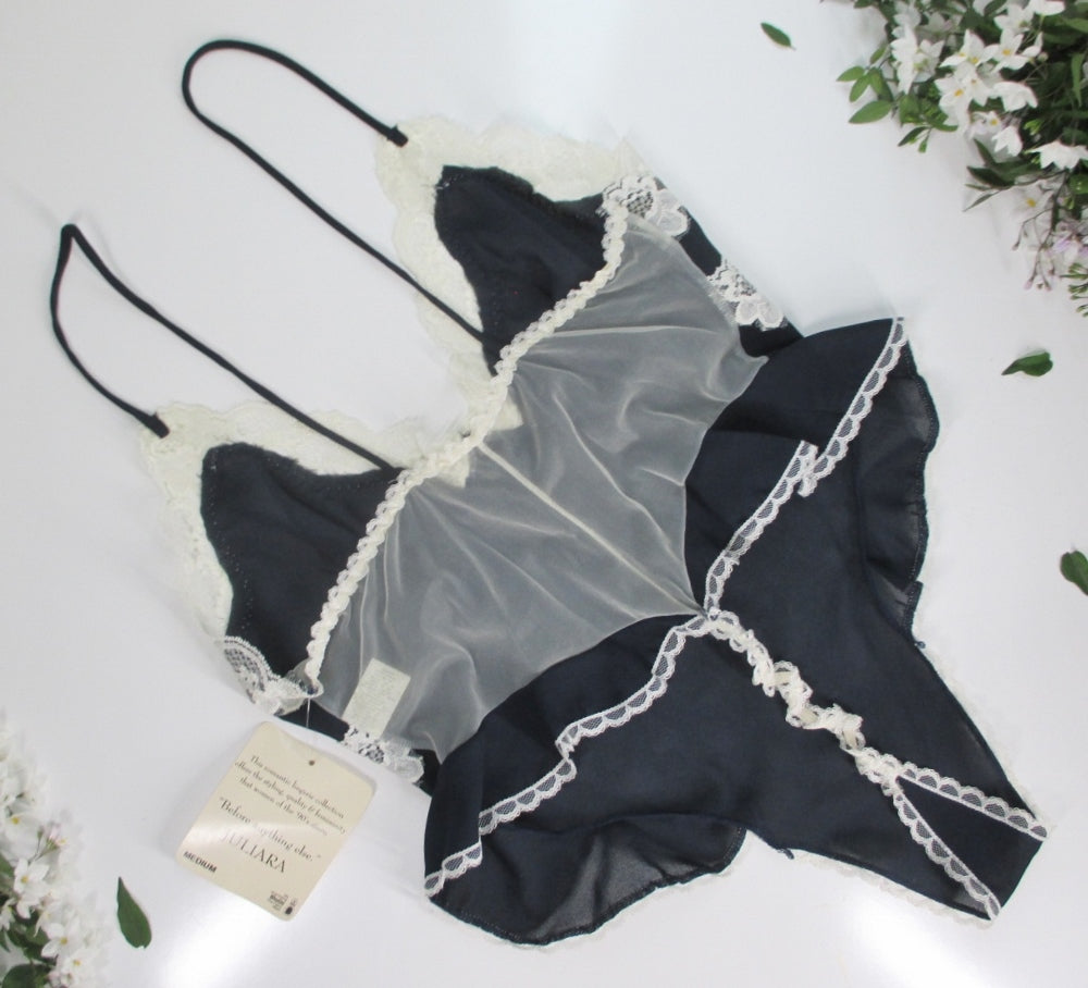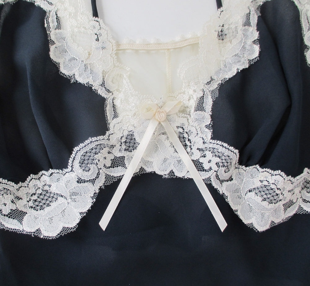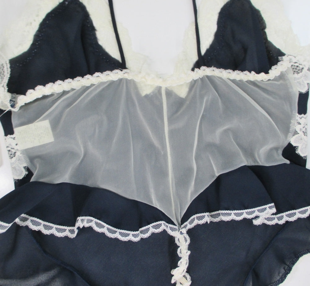 A vintage 90's, dark navy blue teddy with antique whte lace trim