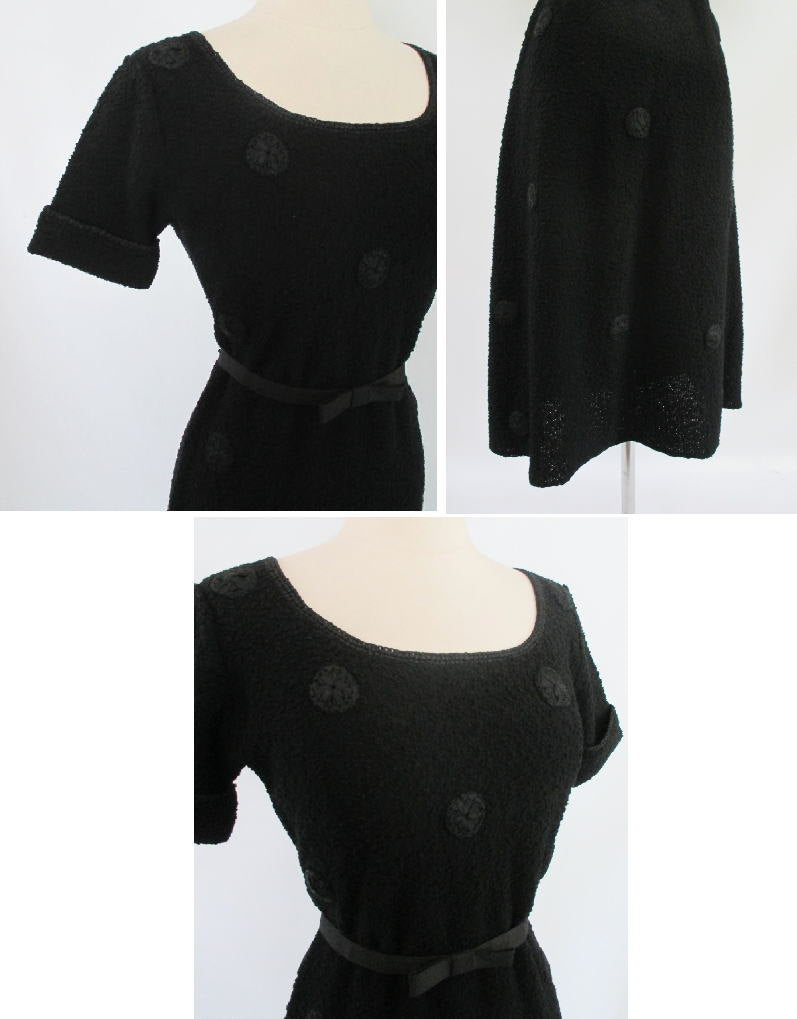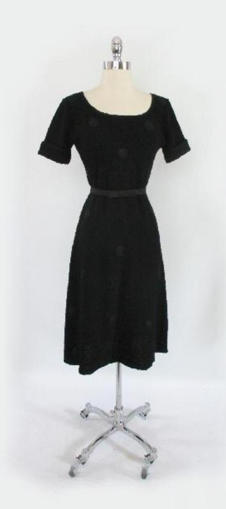 A charming 1940's black knit dress with black ribbon polka dots.