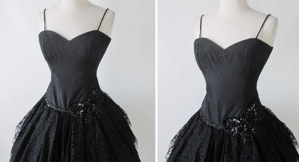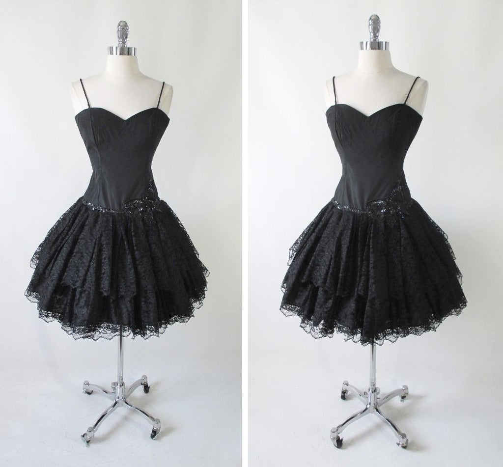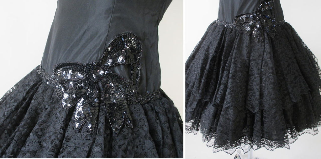 Vintage 80's Sweetheart Black Lace & Sequins Full Skirt Party Dress