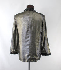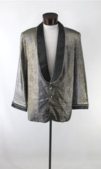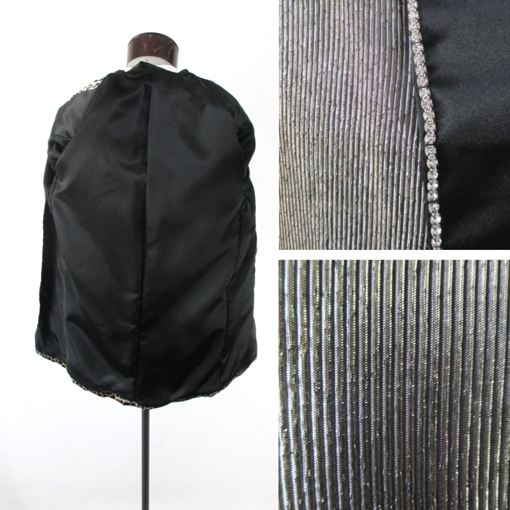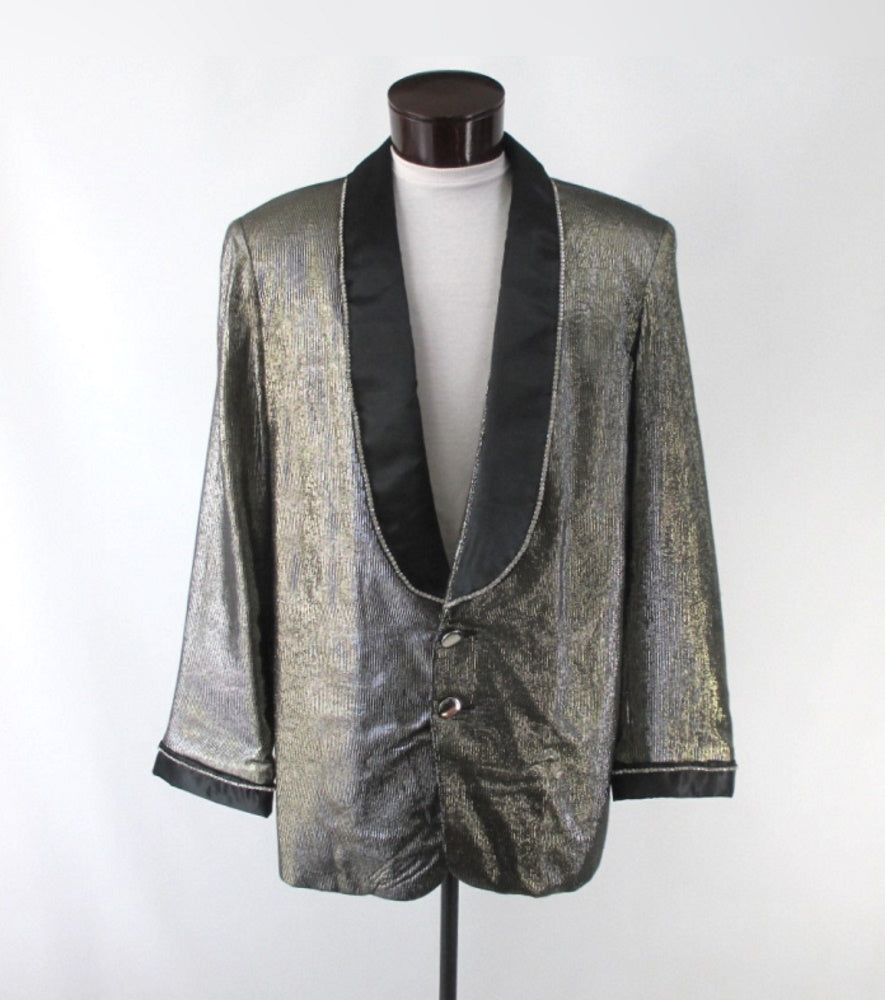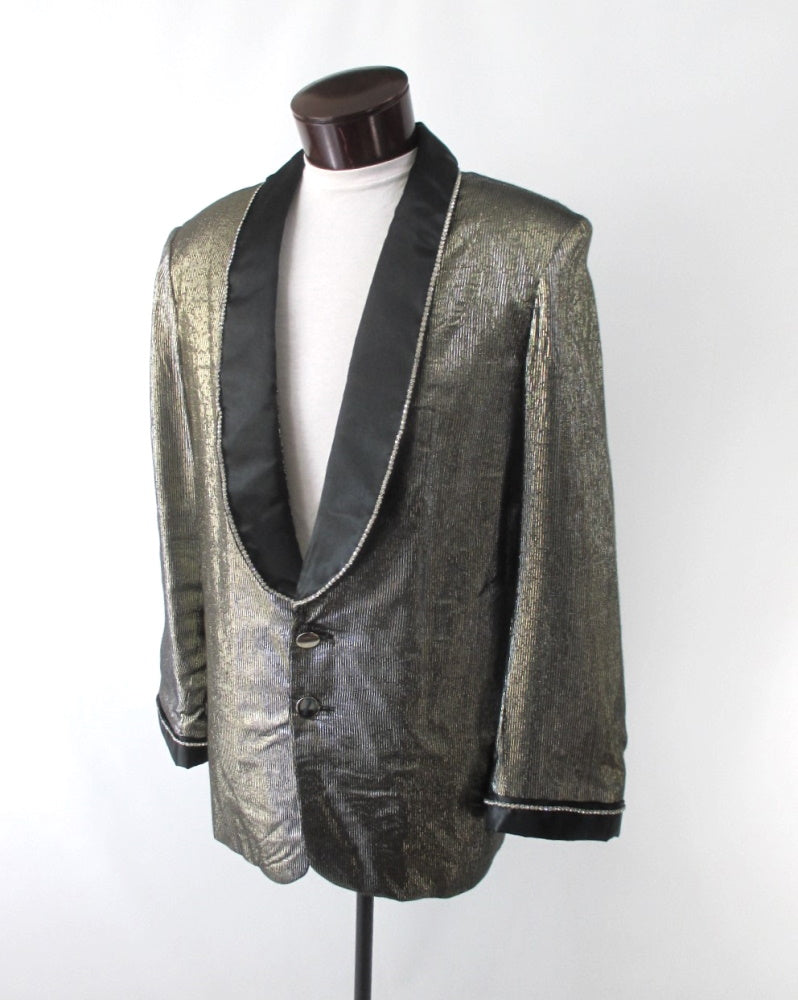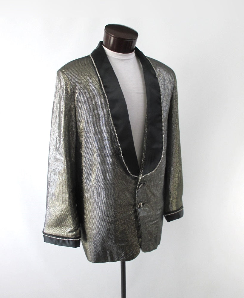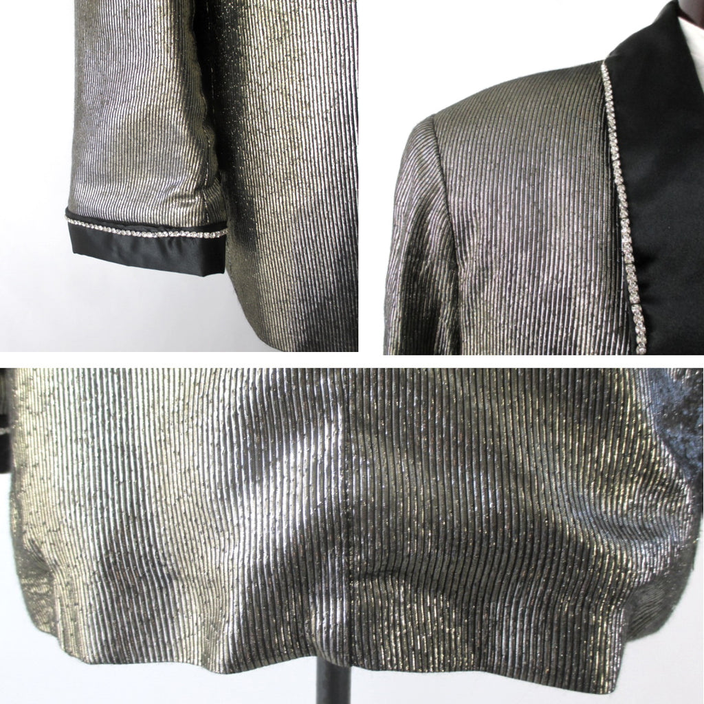Gold rows of lame with black satin shawl lapel edged in rhinestones.