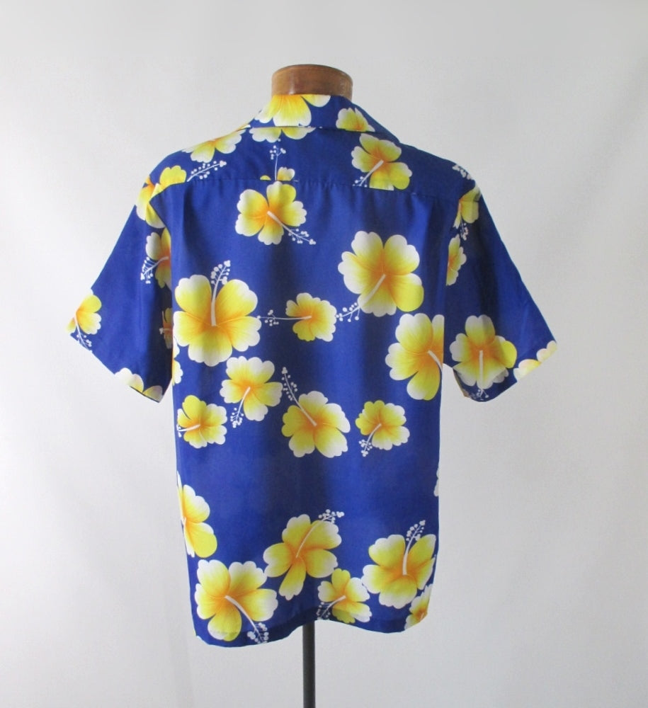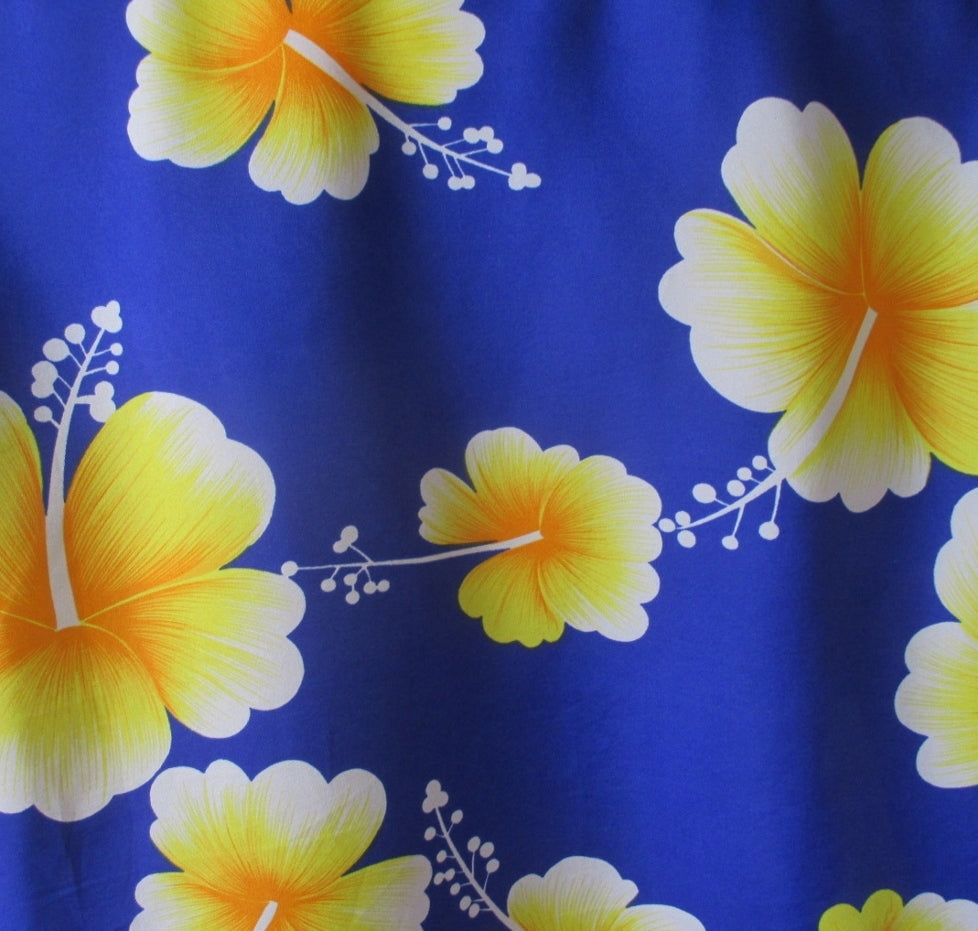 Royal blue with golden yellow and white hibiscus