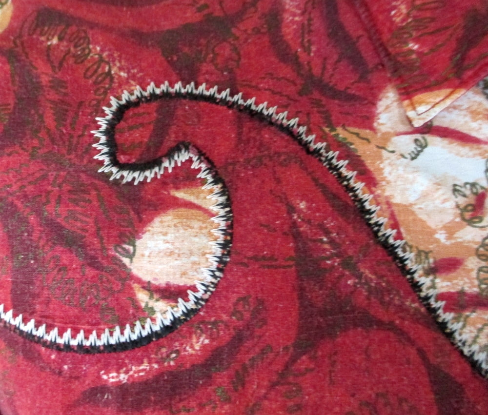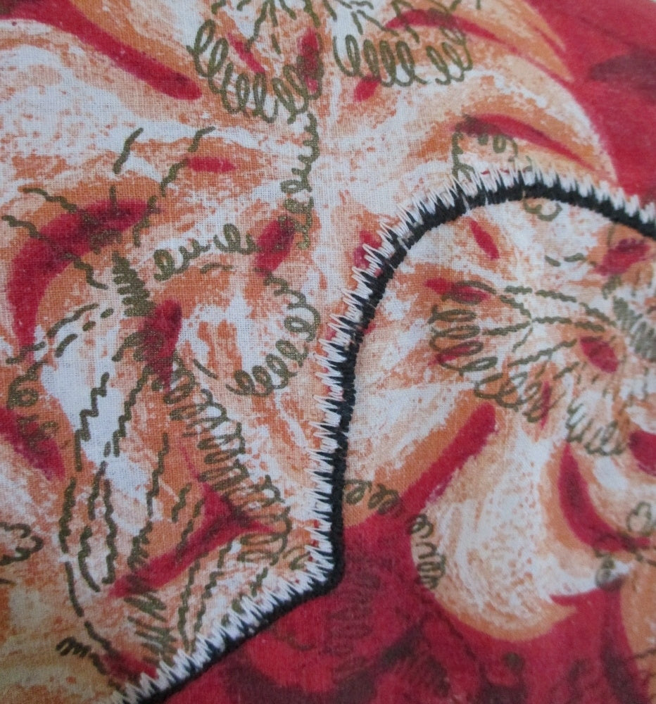 Reds and white leaf print with hints of peach and gold butterfly outlines.