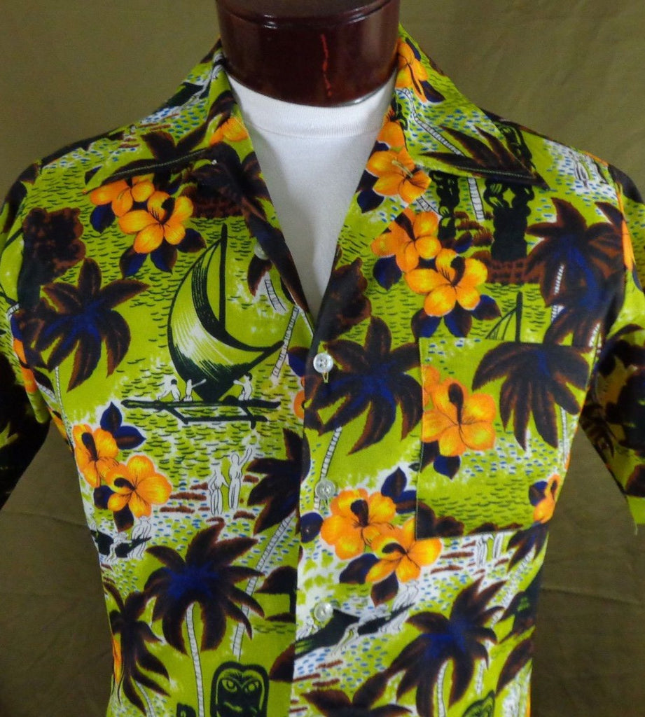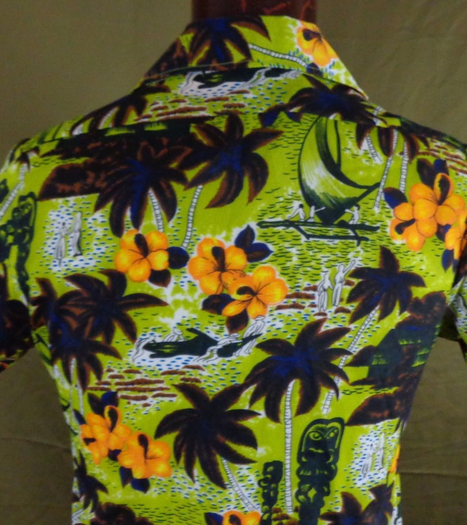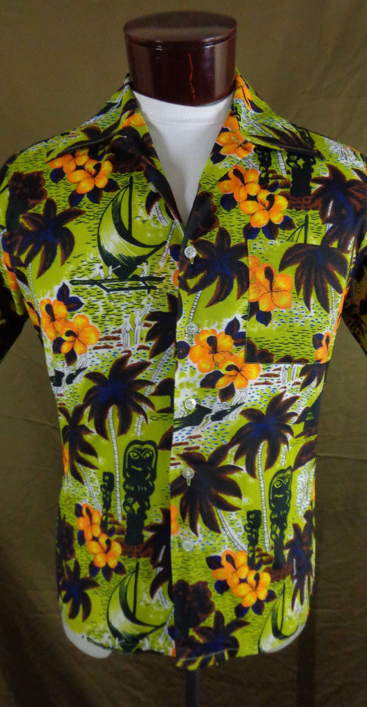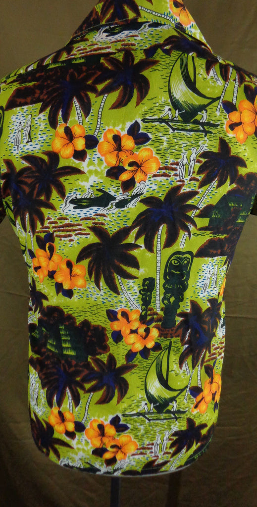 The shirt is made of 100% crepe polyester, is a base green, has clear plastic buttons and a contrasting chest pocket. The print features people at the beach both in the water and outriggers. There are also palm trees, orange hibiscus flowers and tiki god statues. This shirt is sized at a Medium.