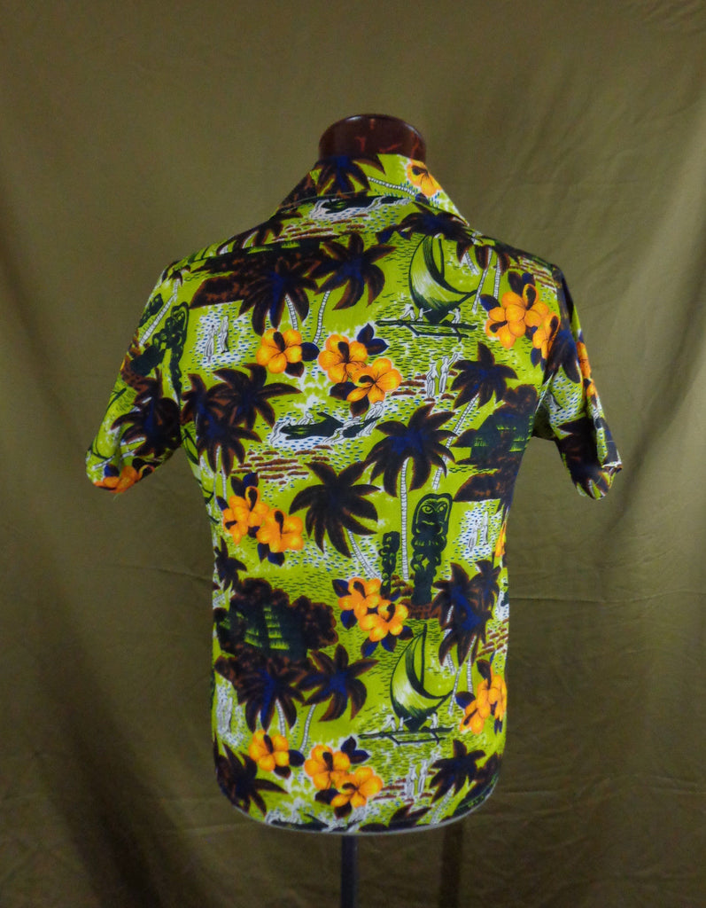 Vintage 70s Waikiki 76 Green Tiki Beach Print Hawaiian Aloha Shirt L