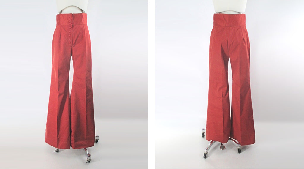 Pants have a extra wide waistband, multi-button front fly and flared bottoms.