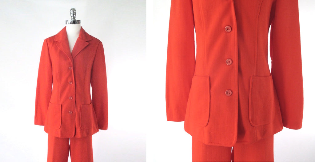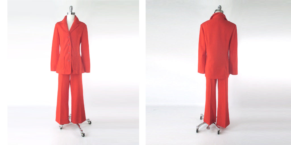 Vintage 70s Orange 3 Piece Suit Set Blazer Skirt Pants L
