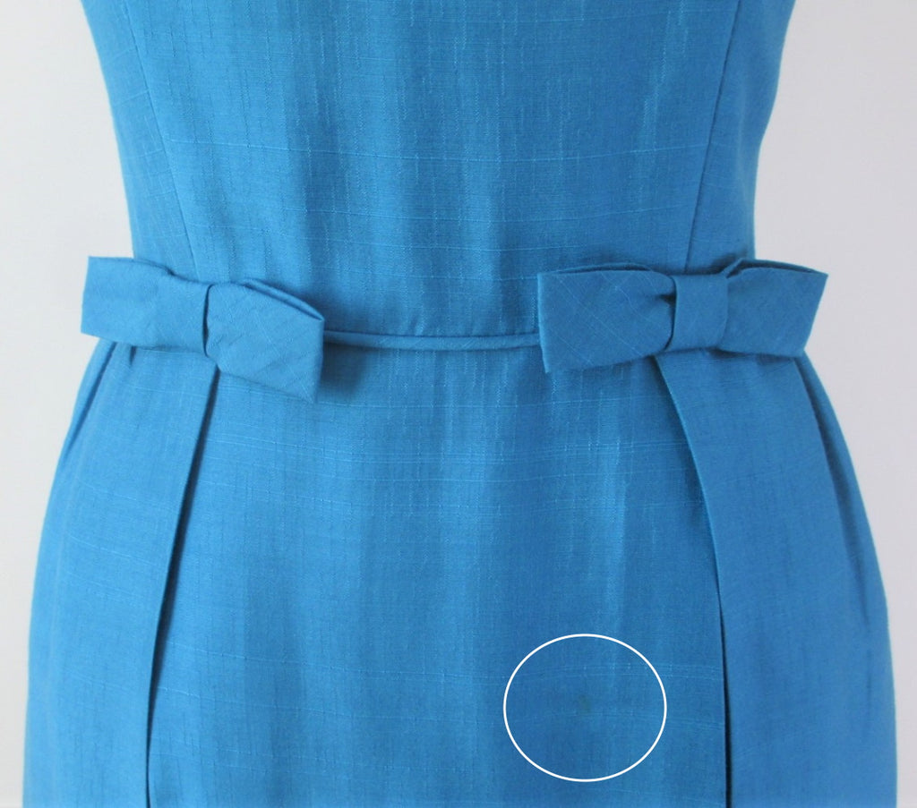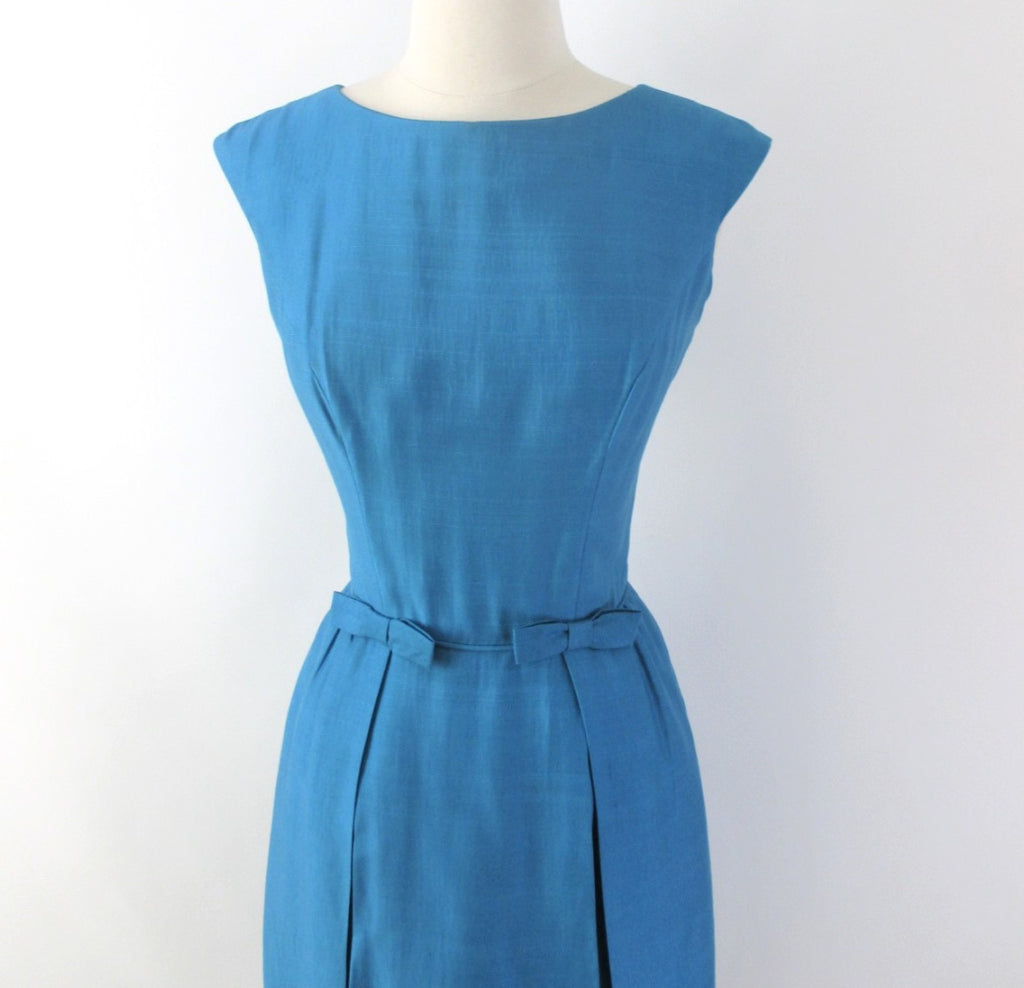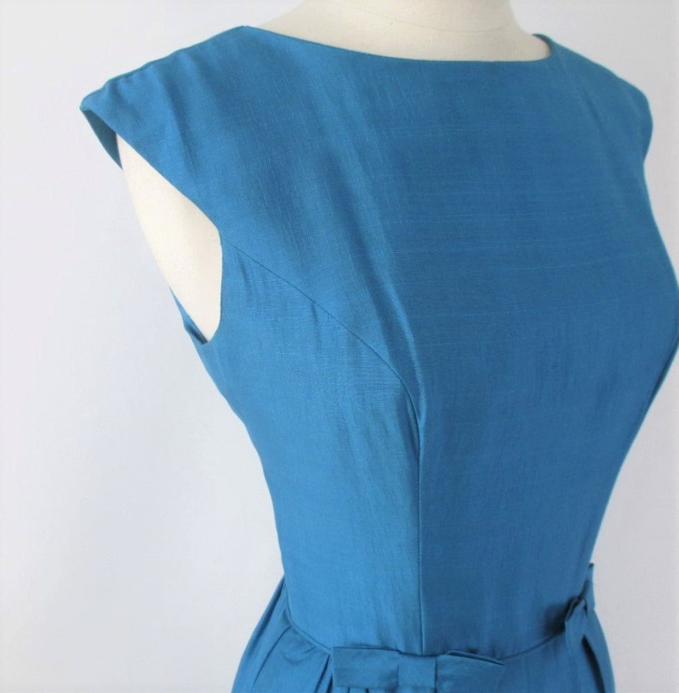 Lovely blue sheath dress with cap sleeves, princess seams and bateau neckline.