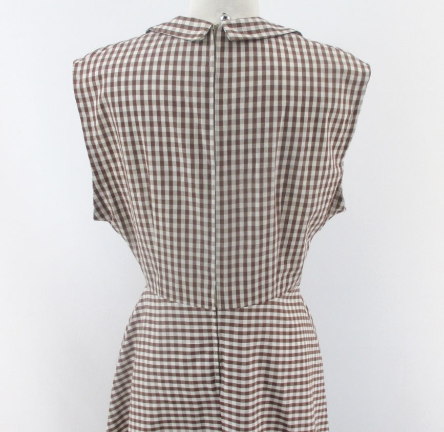 Vintage 50s Brown Gingham Wide Collar Day Dress L