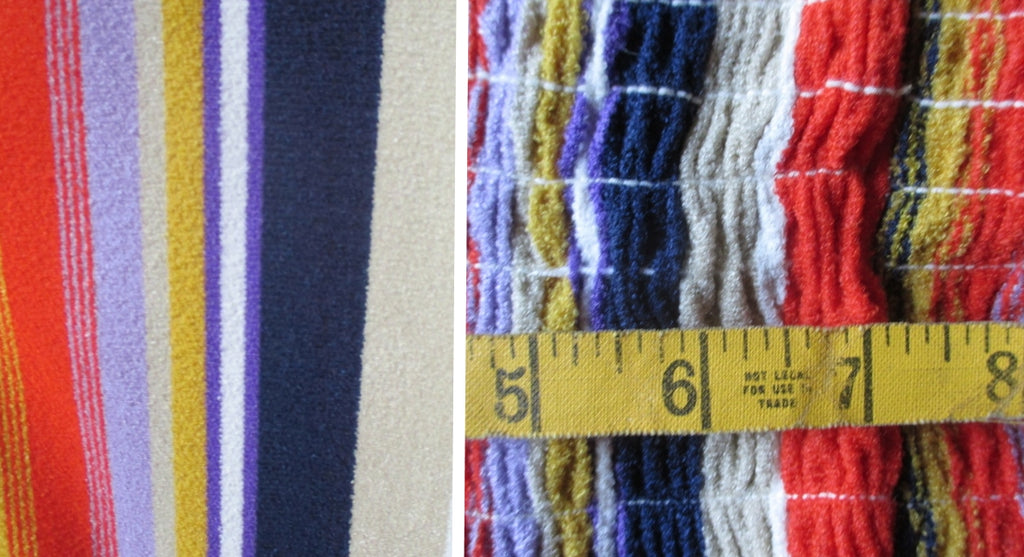 Striped terry cloth in mult-colors, white, navy blue, purple, goldenrod and red-orange.