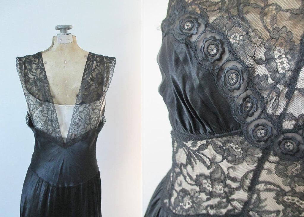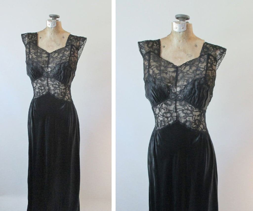 Vintage 40's Artemis Black Satin Sheer Lace Nightgown 34