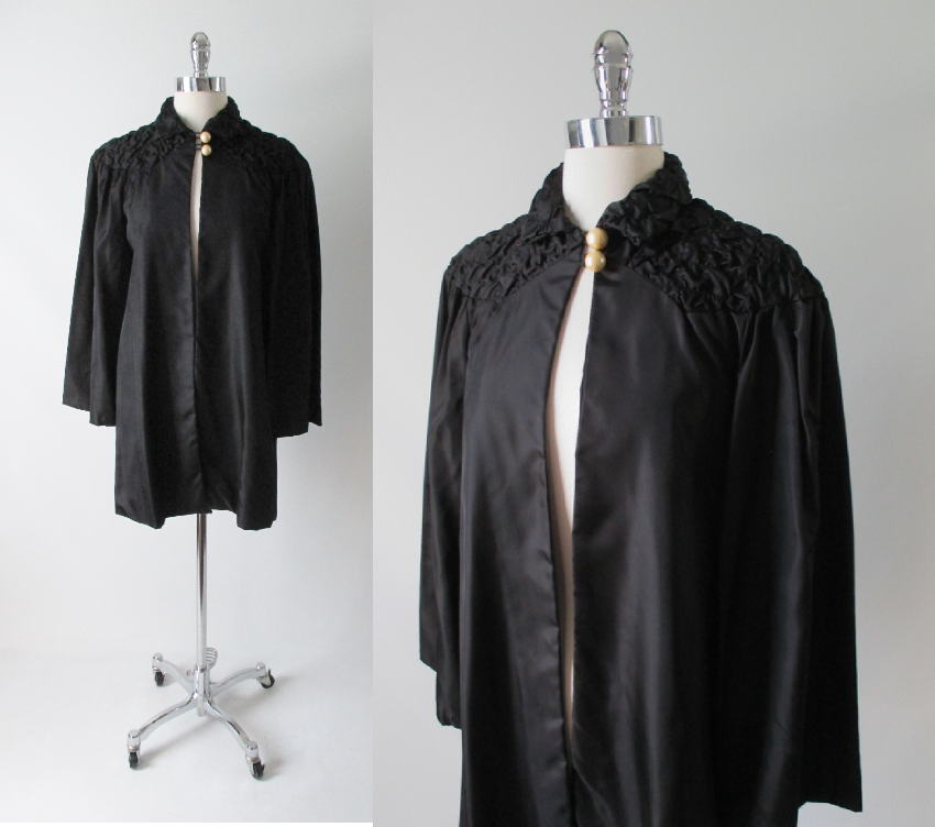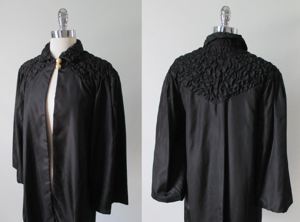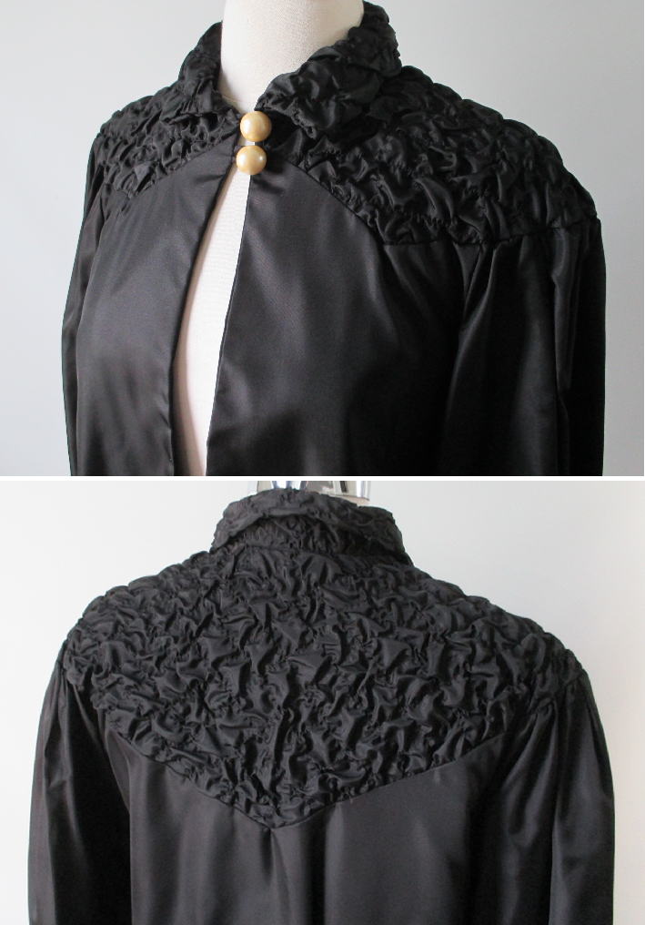 Black taffeta with rounded collar and quilted shoulders & yokes.