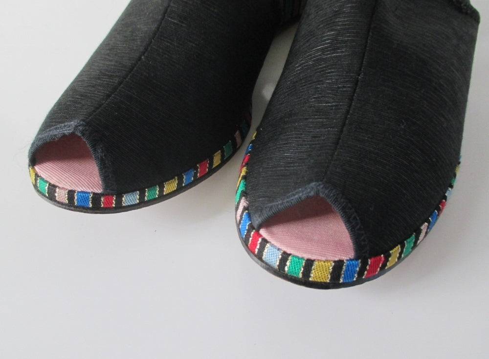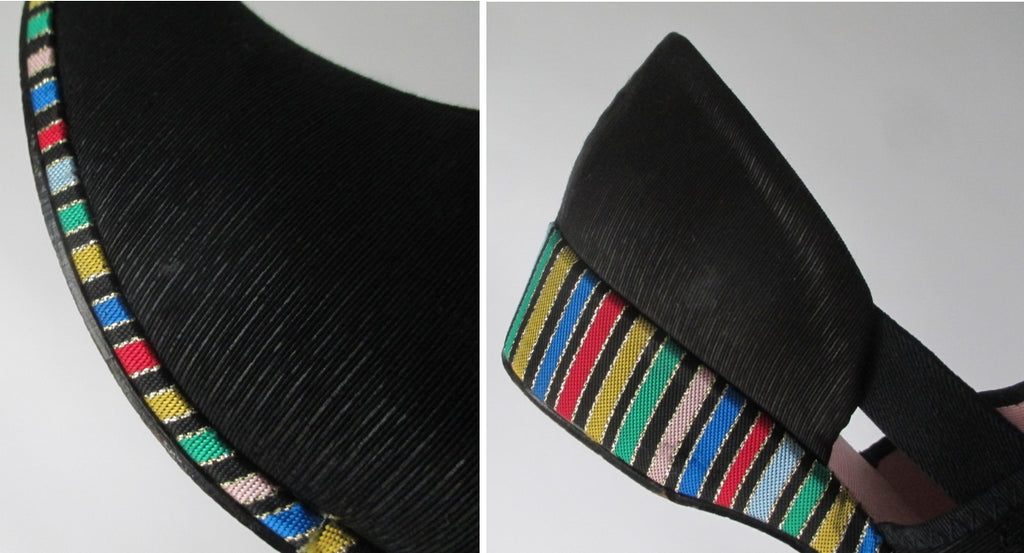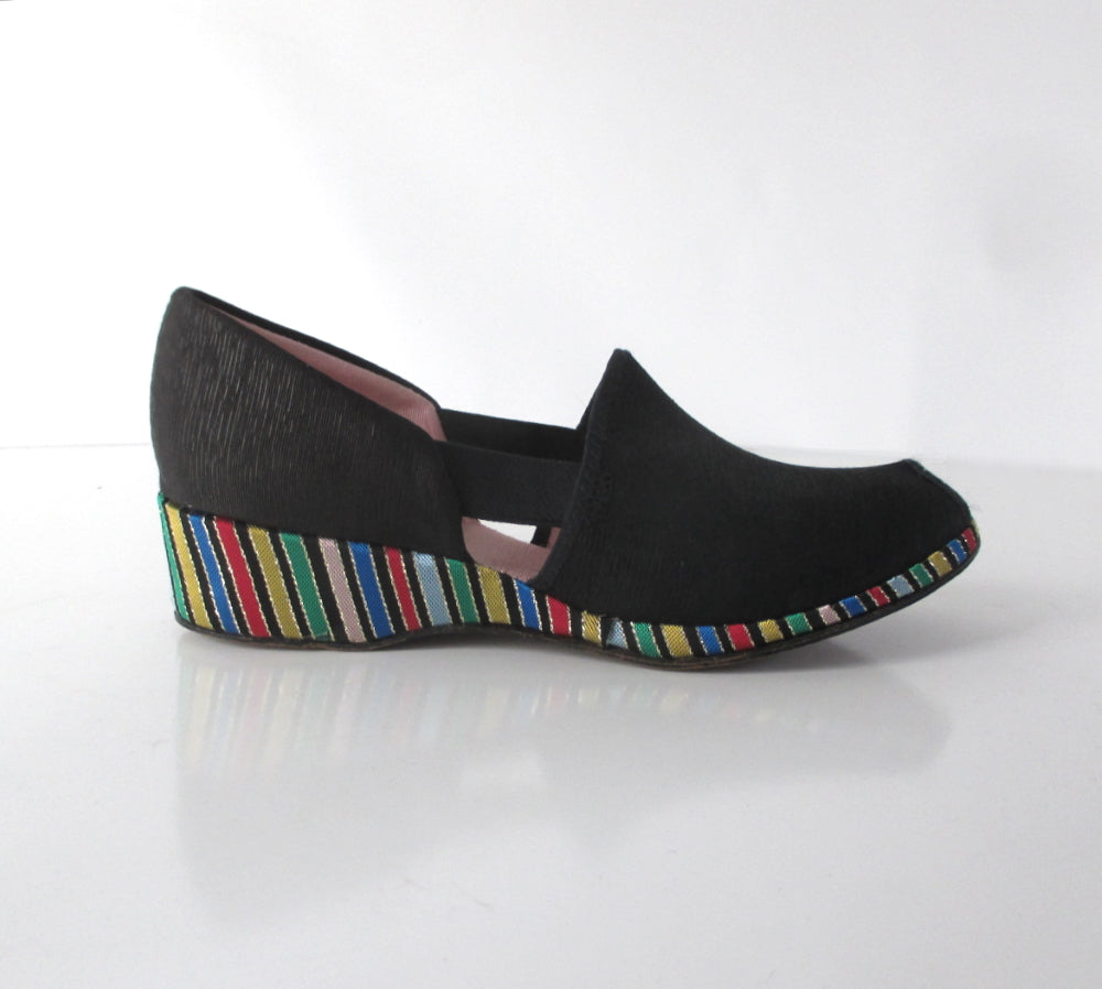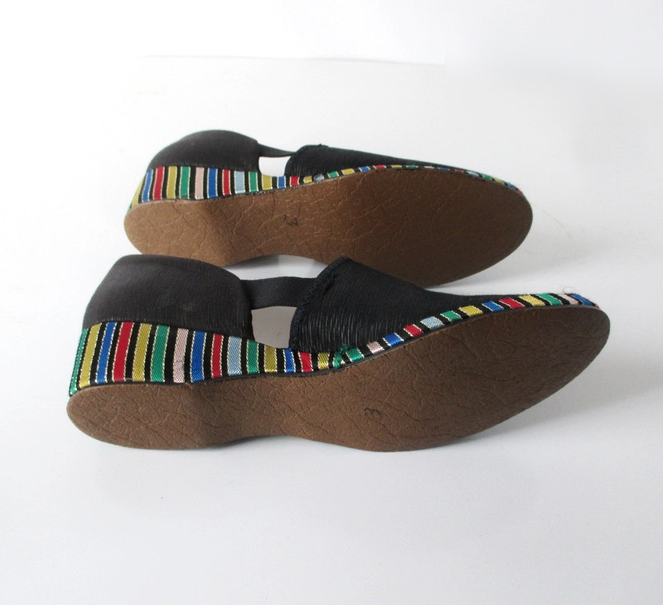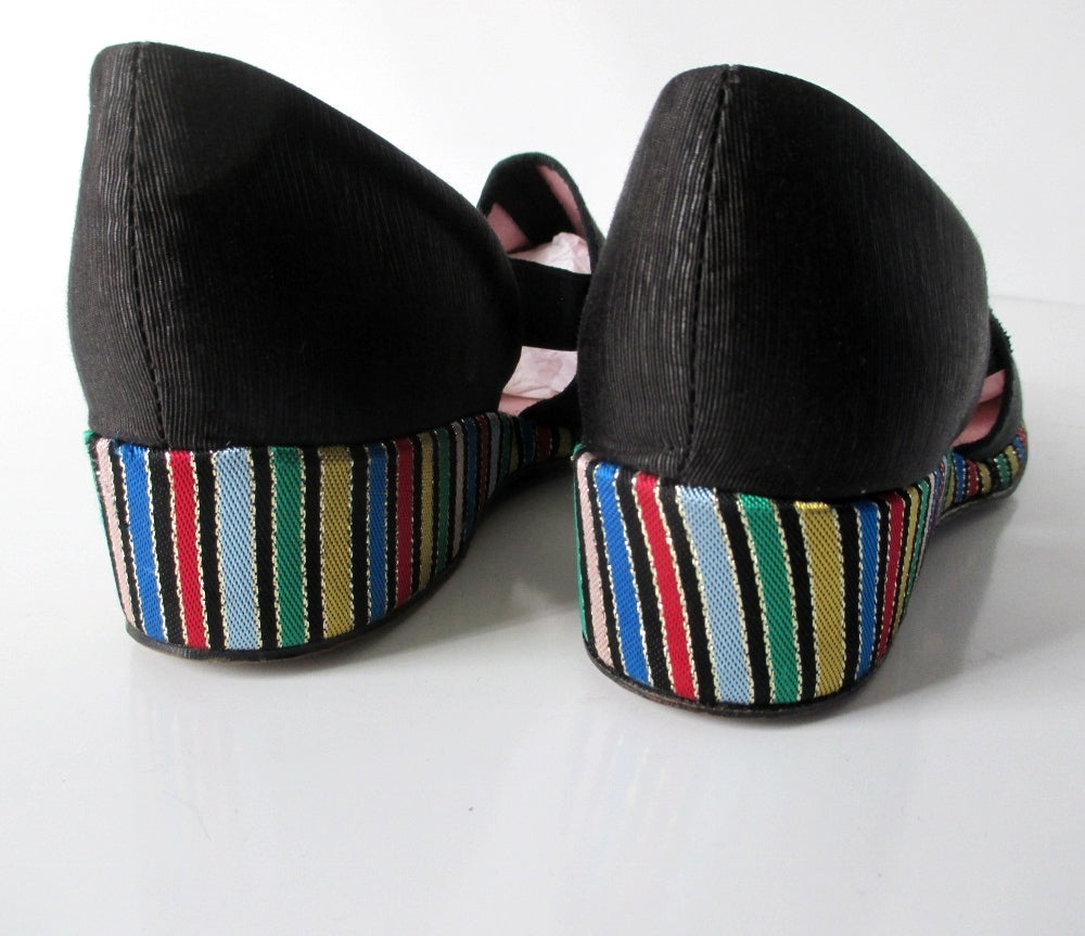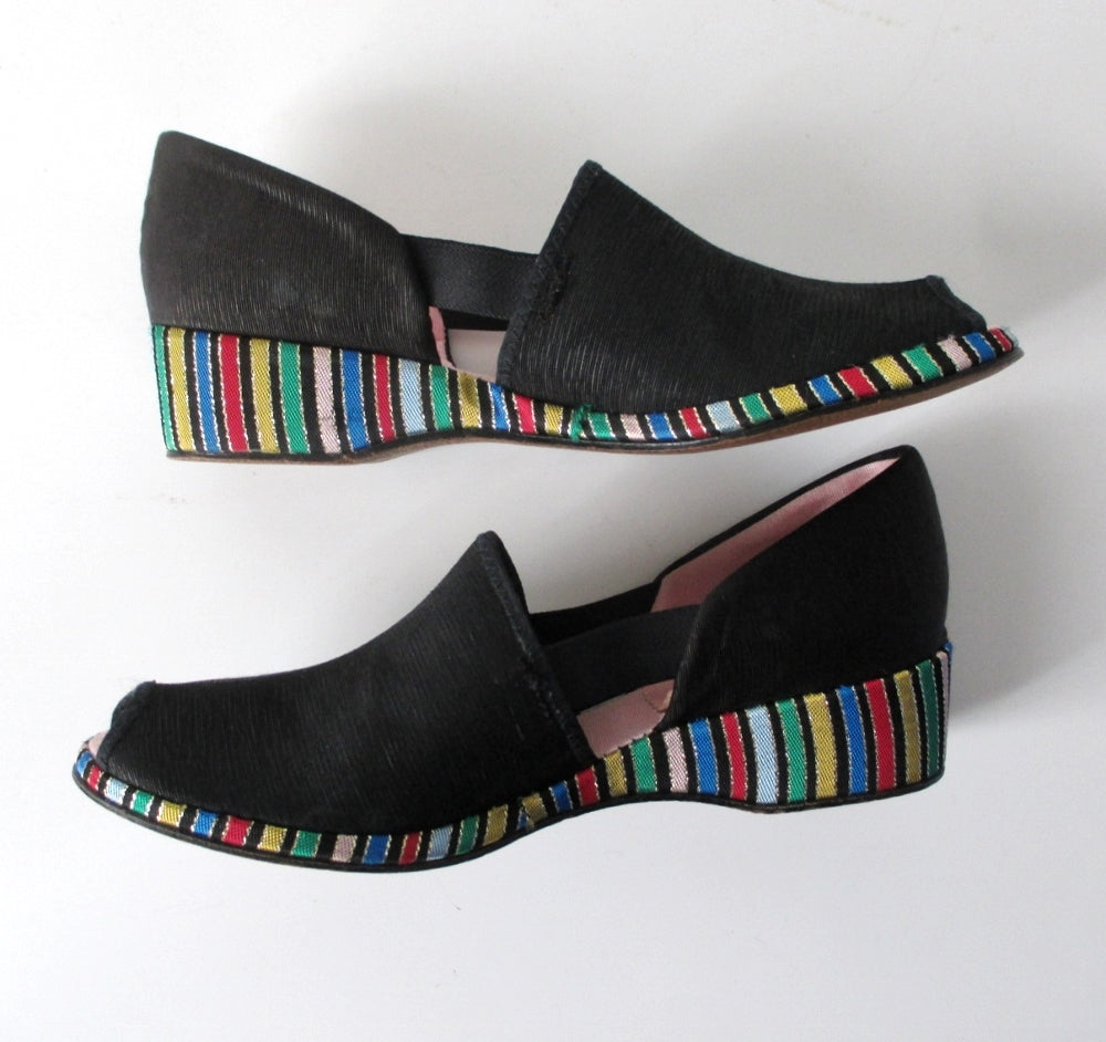 Vintage 30s 40s Black Faille Striped Wedge Slippers Shoes 8