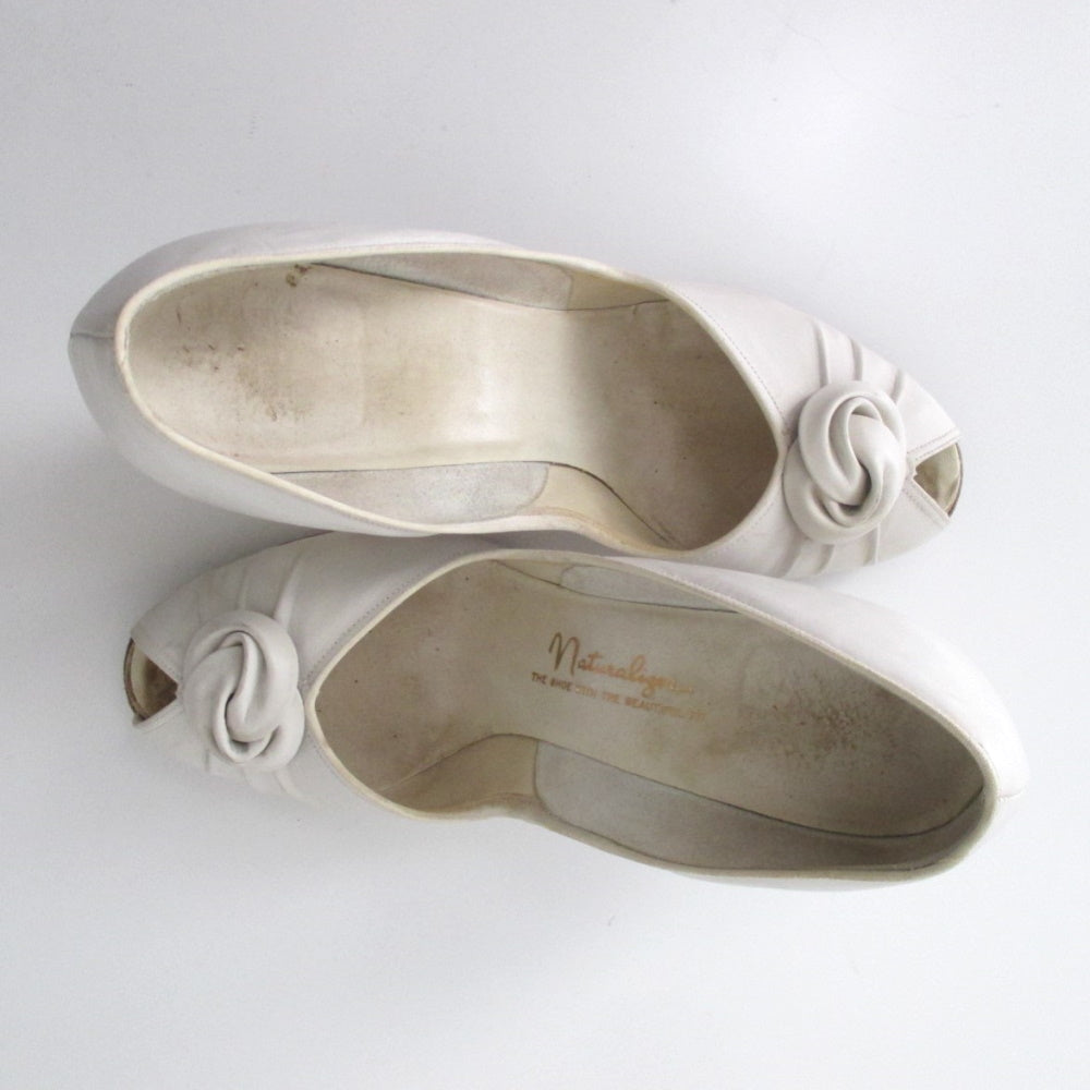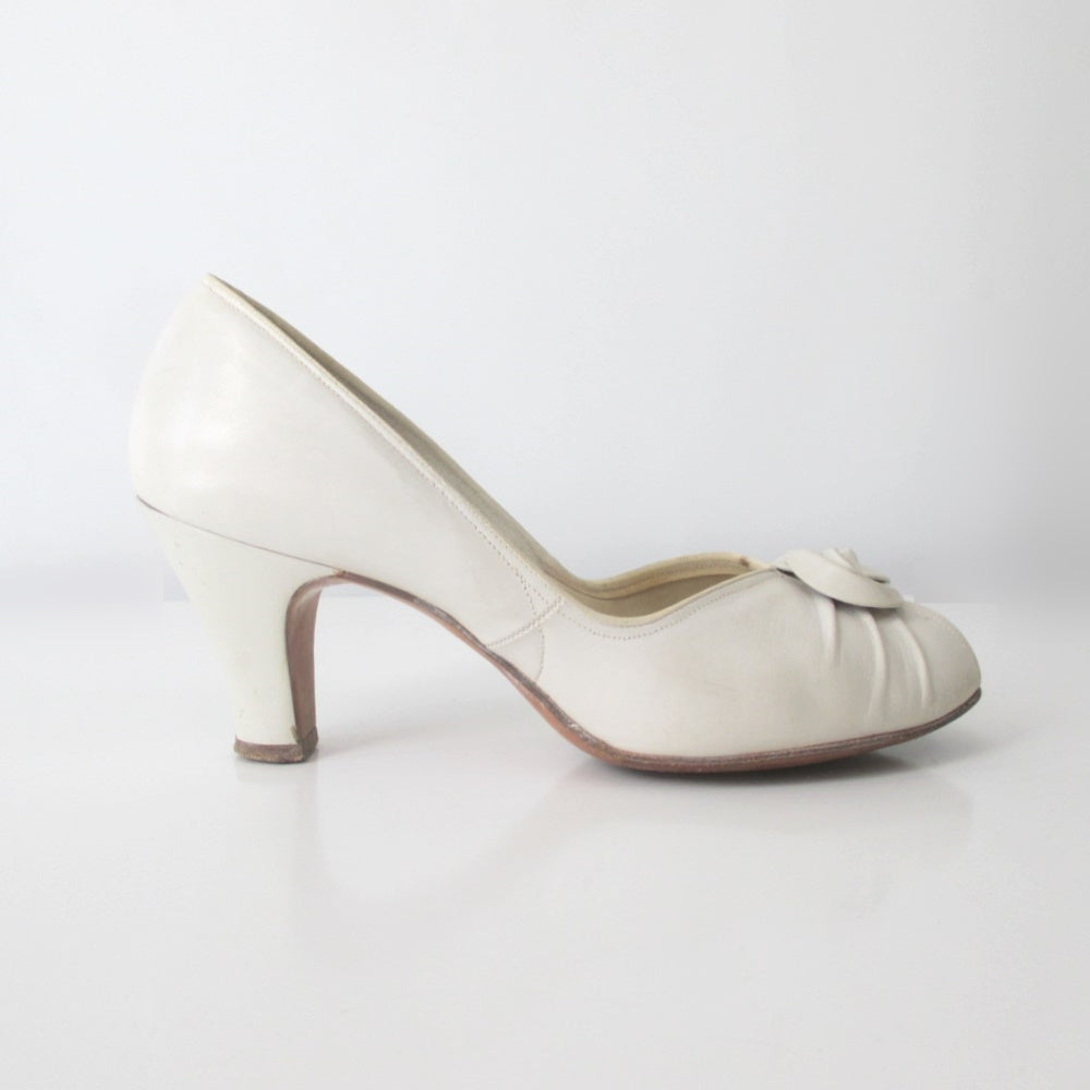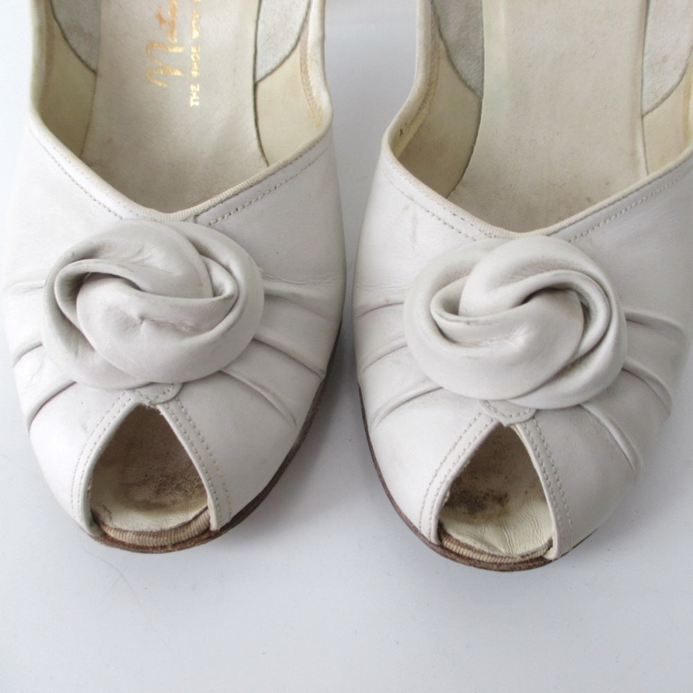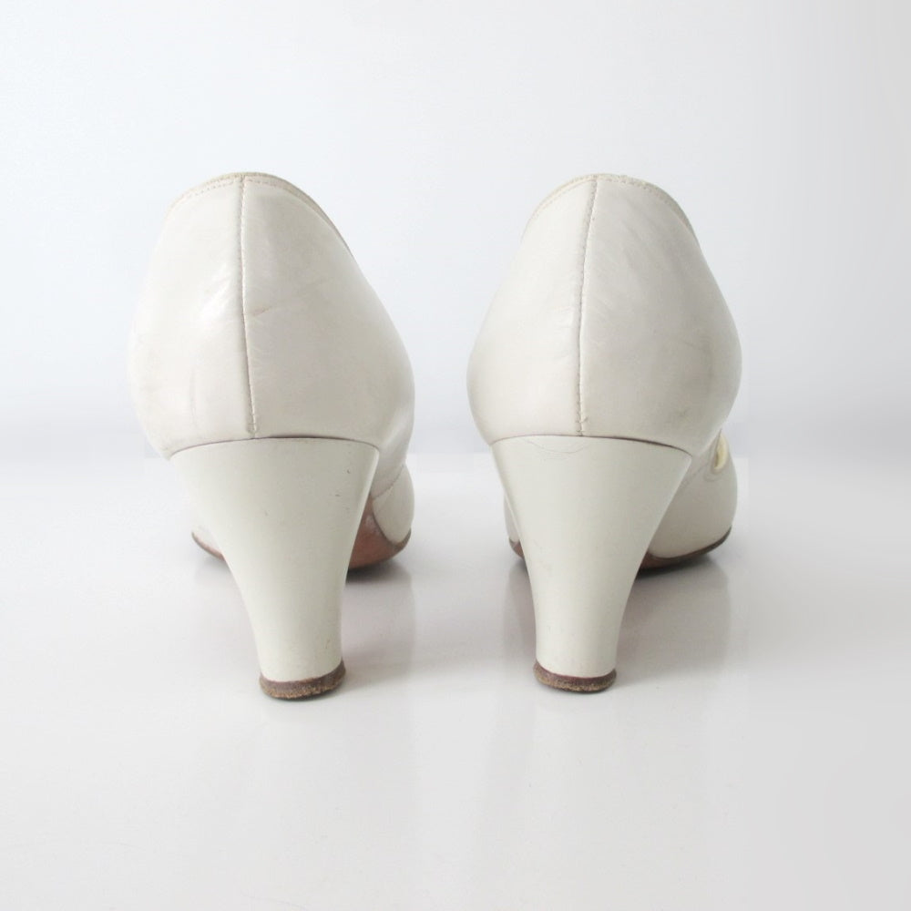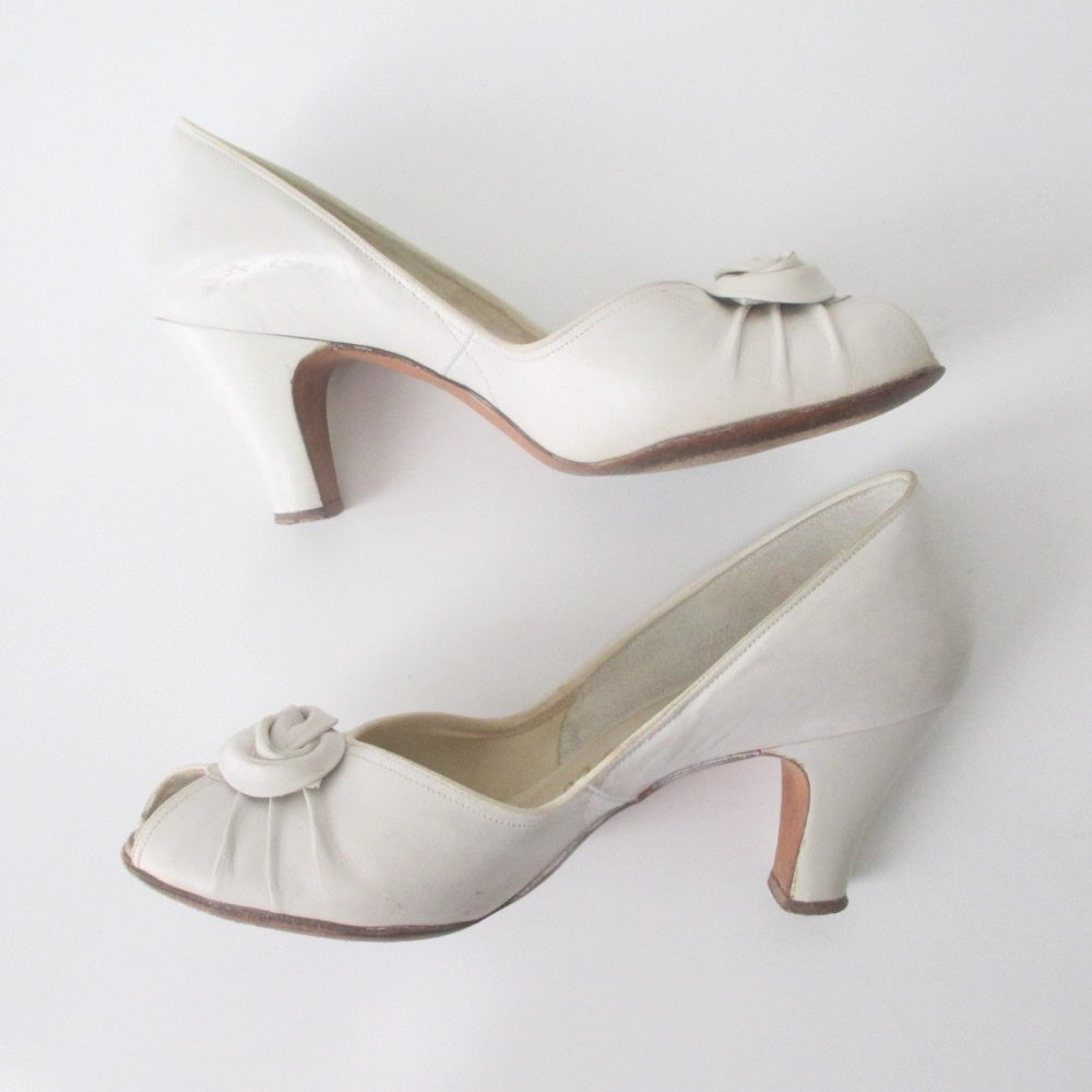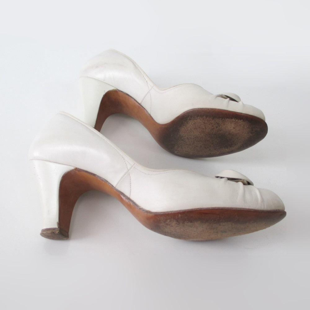 Vintage 40s 50s White Knotted Vamp Peep Toe Heels Shoes 7 / 7.5