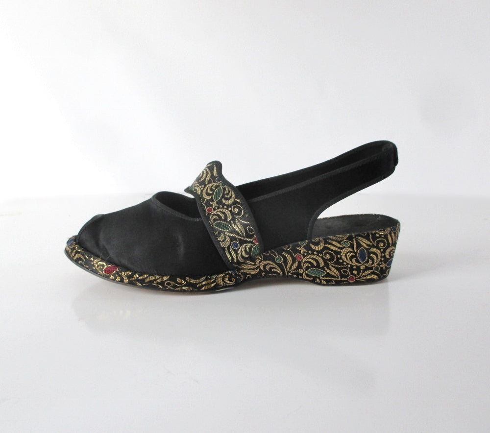 Vintage 40s Black Satin & Gold Brocade Slingback Wedge Slippers / Shoes 8