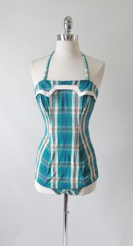 A fun vintage swimsuit / bathing suit by Rose Marie Ried in a bold plaid.