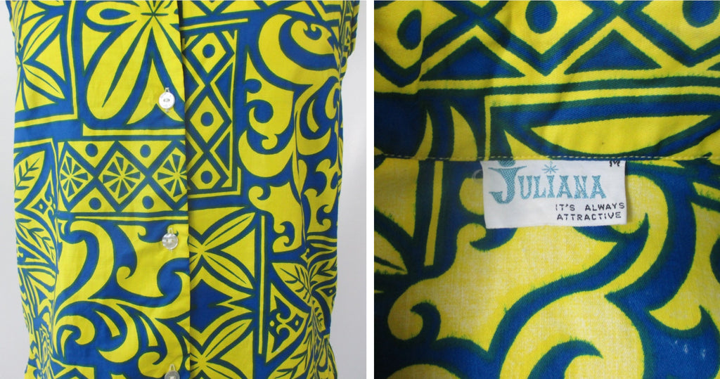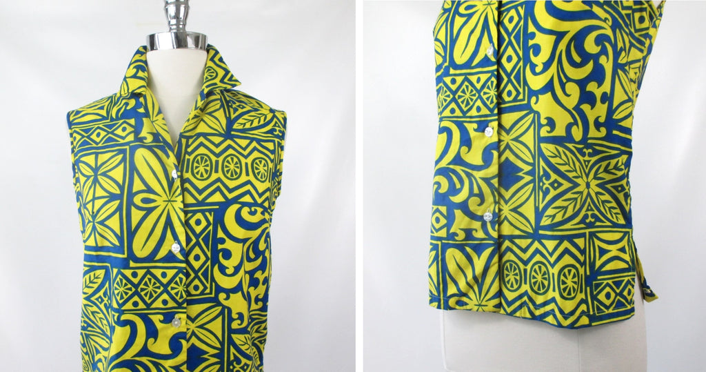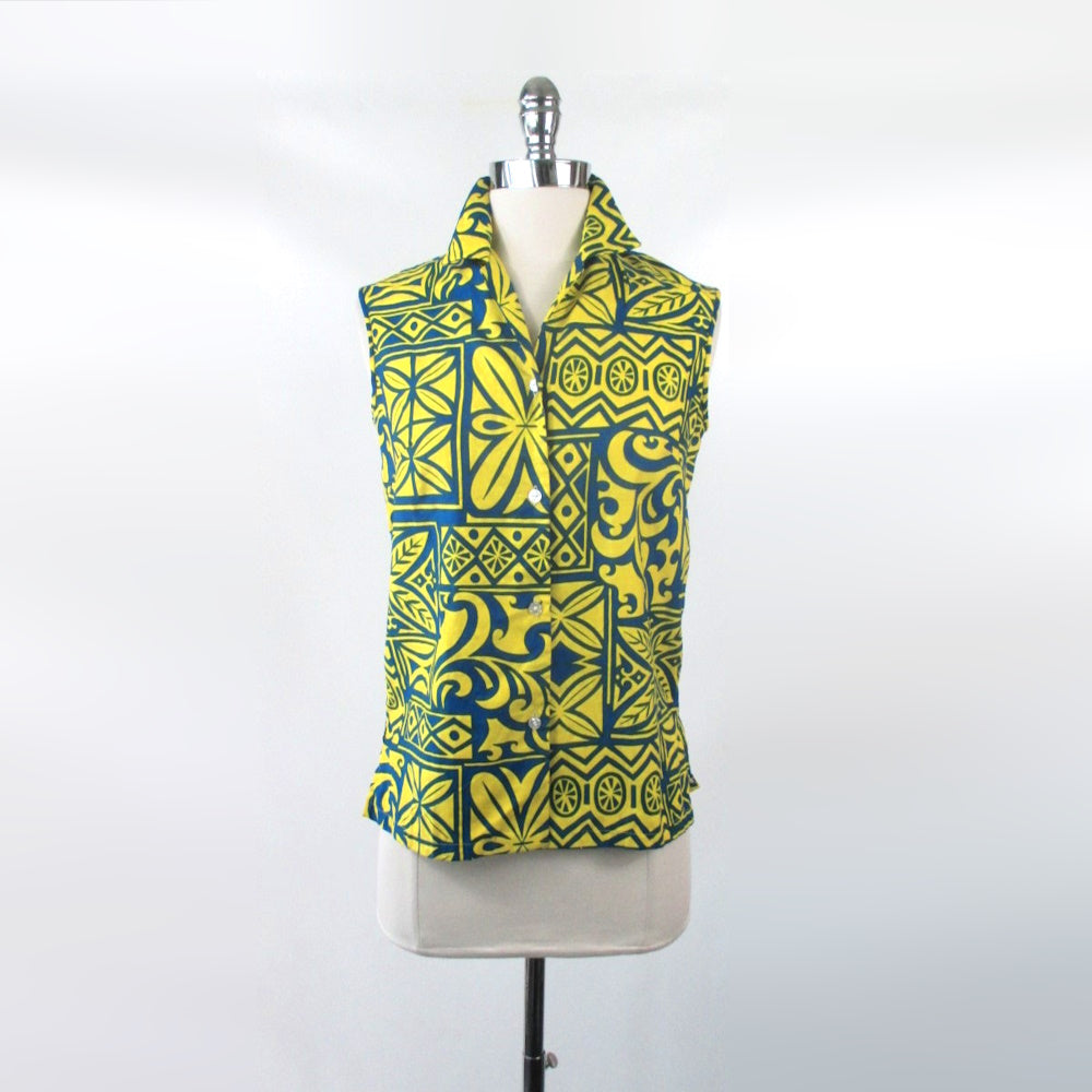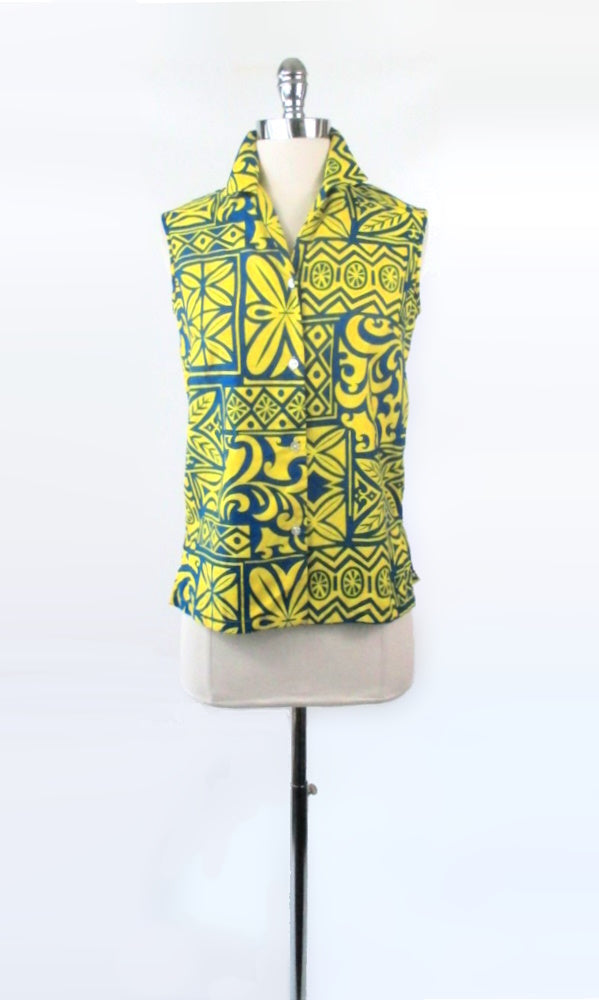 Vintage 60s Blue & Yellow Hawaiian Sleeveless Top S