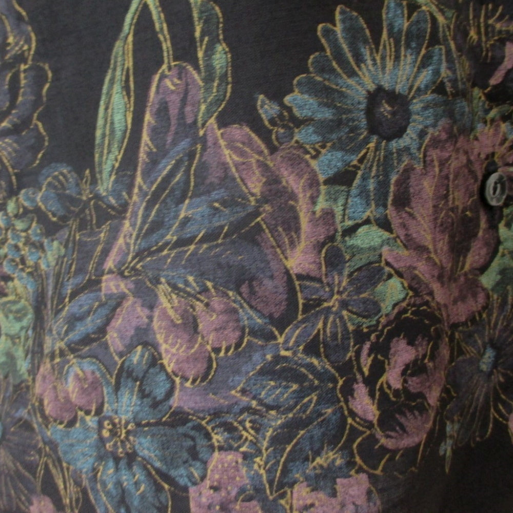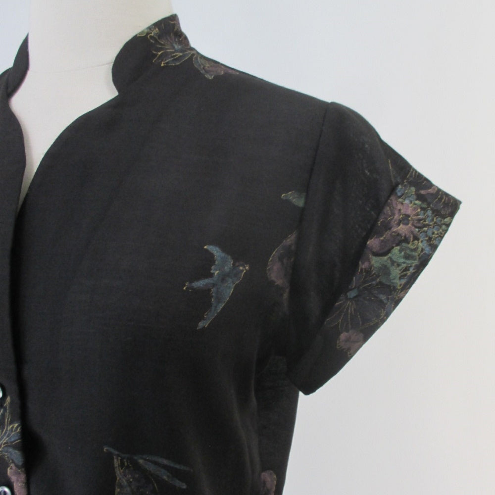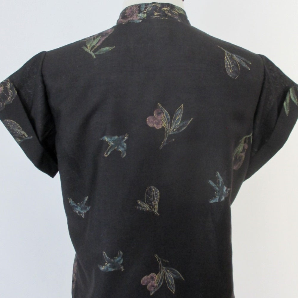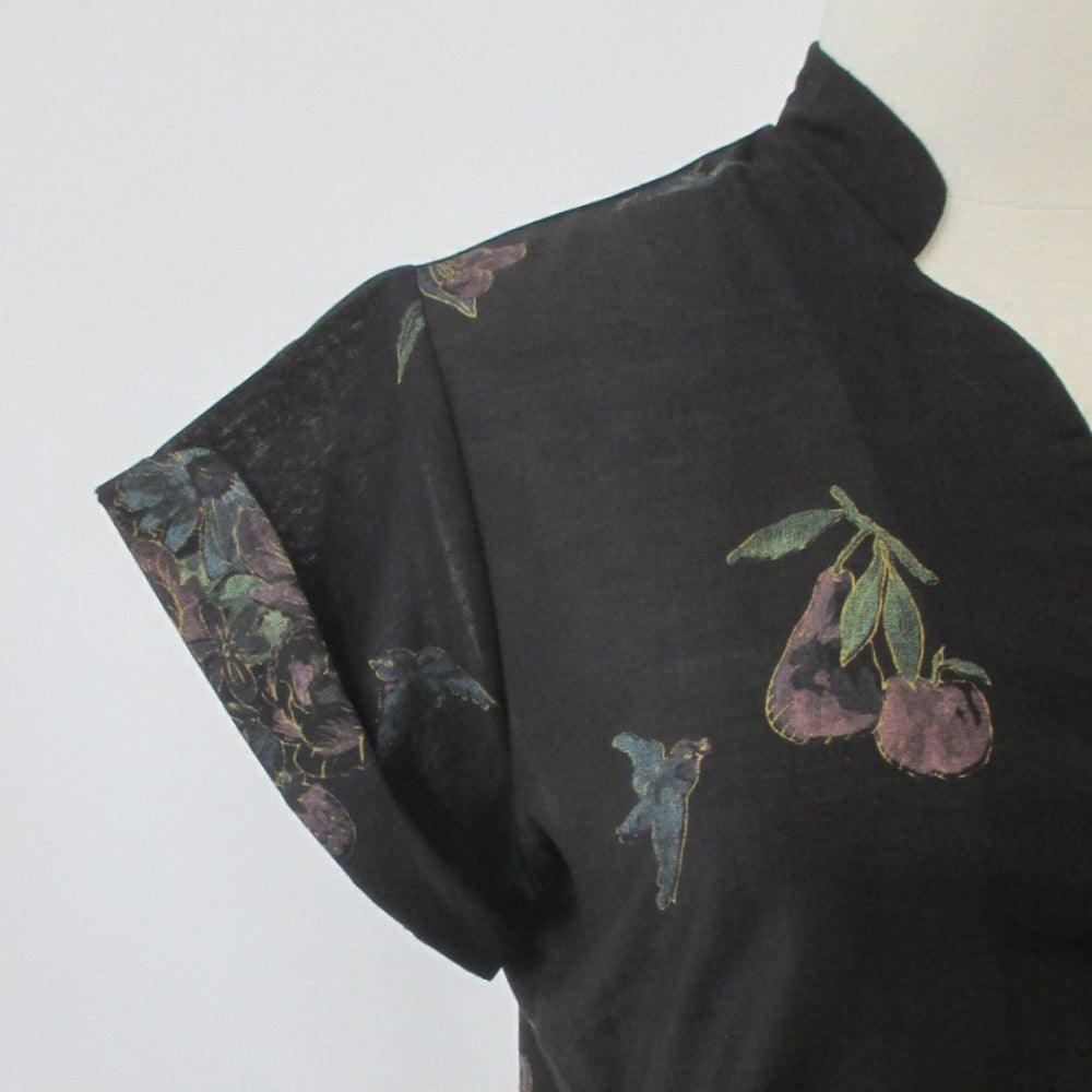 Black base with a jewel tone floral, fruit and bluebird print edged in gold.