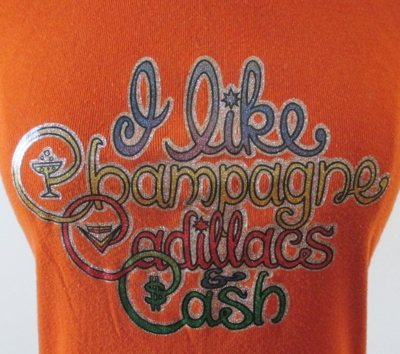 Glitter print that says, "I like Champagne , Cadillacs and Cash"