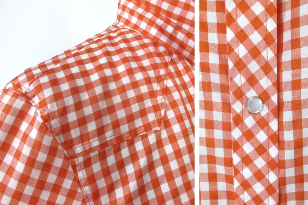 Red and white gingham plaid with classic collar and western yoke.