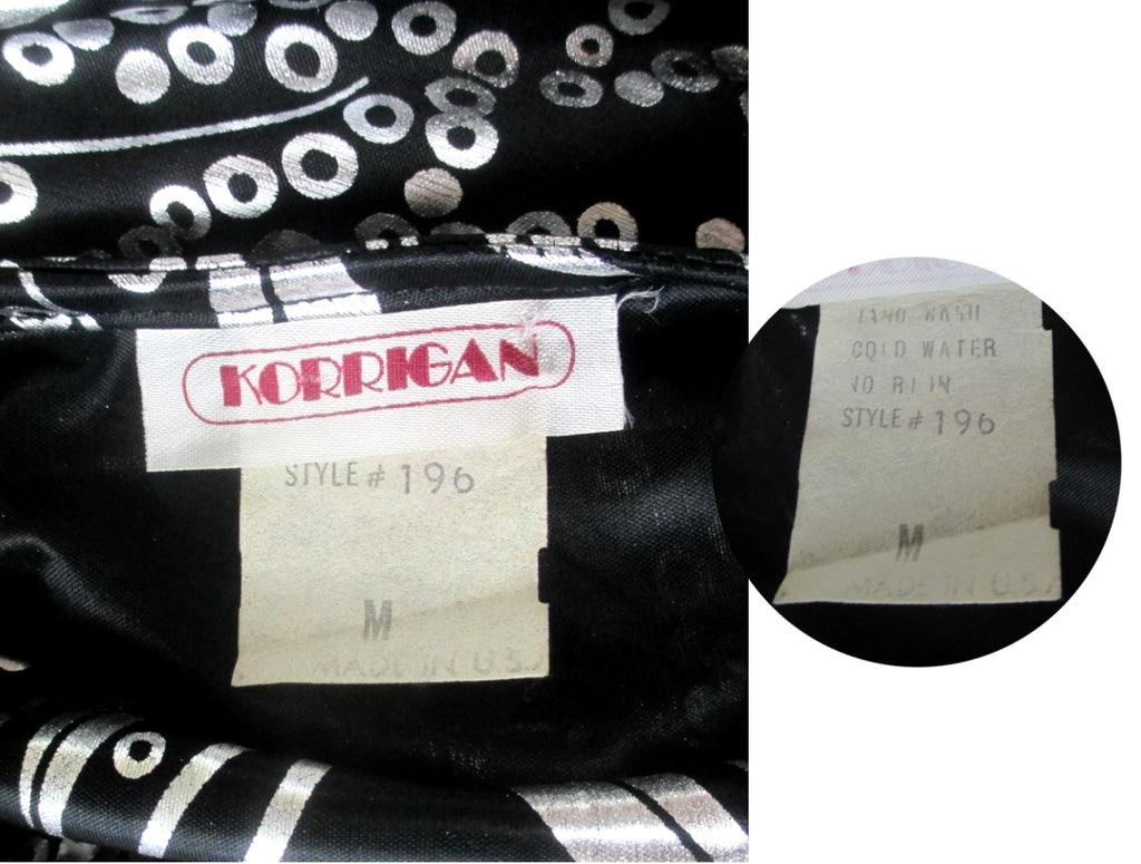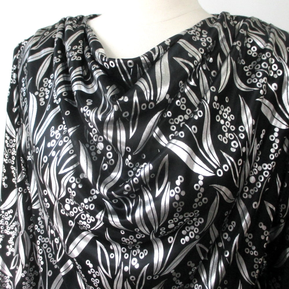 Silky black fabric with silver leaf and circle print.