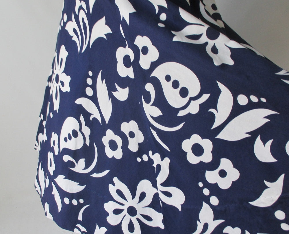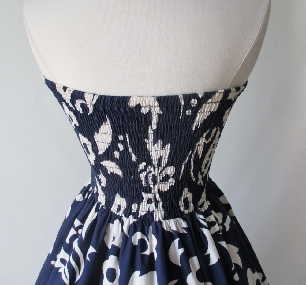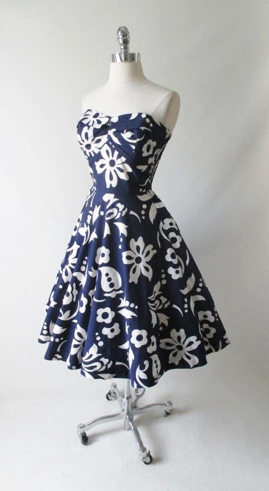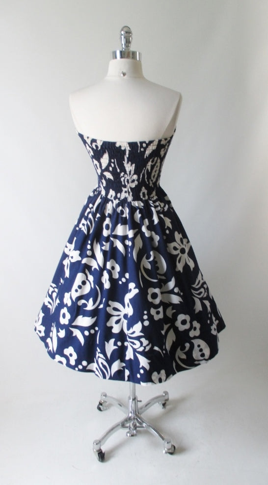 A fun vintage Hawaiian dress in a dark navy blue with white scrolling floral print