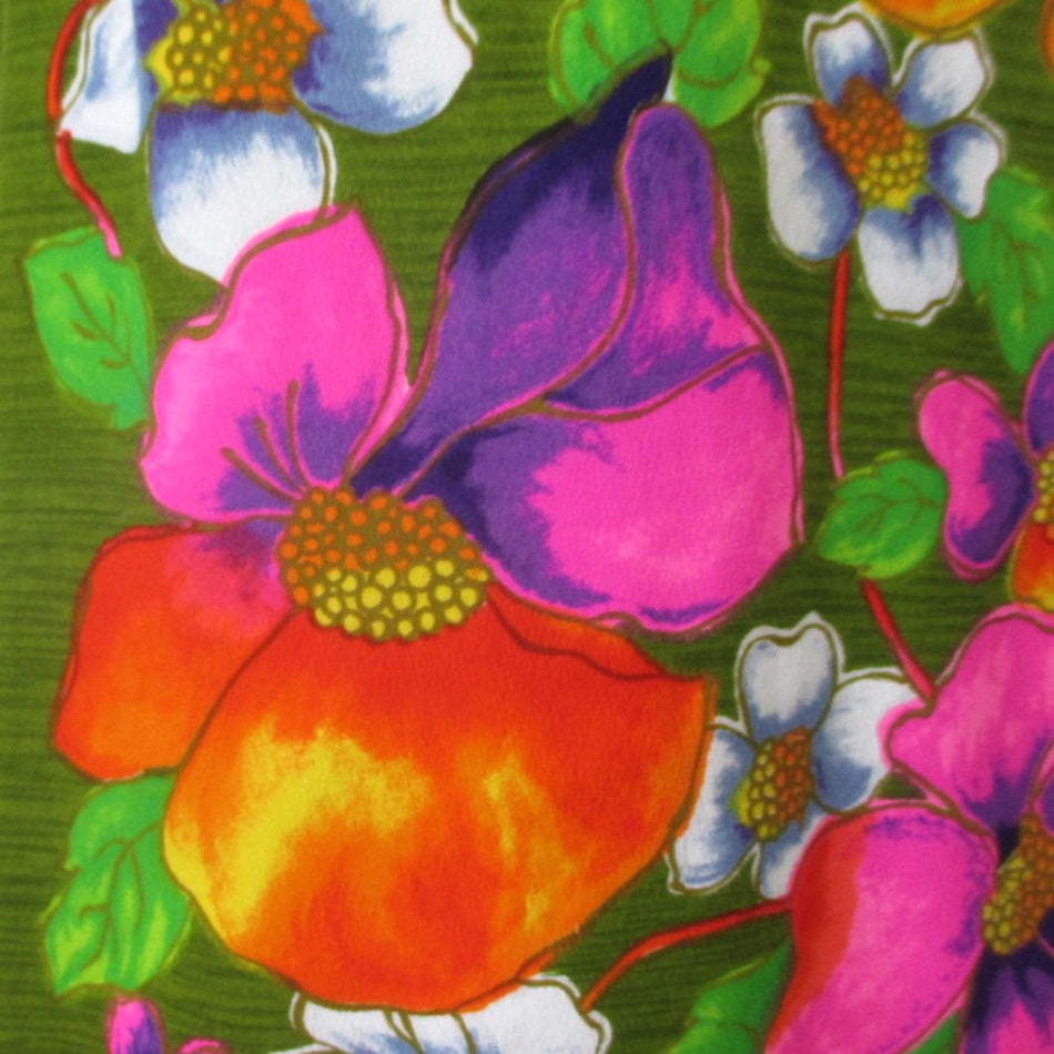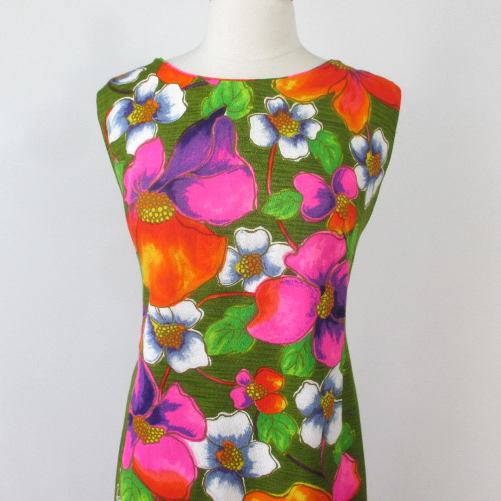 Vintage 60s Vibrant Floral Watteau Pleat Barkcloth Shift Dress XL