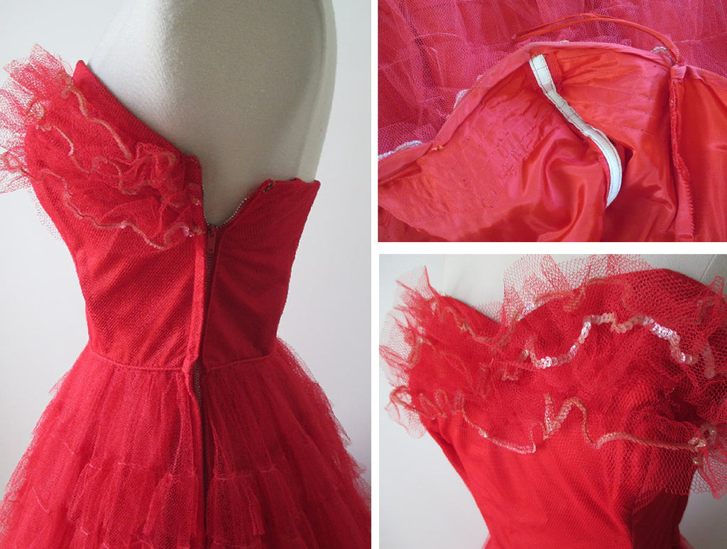 Strapless sweetheart bodice with tulle overlay + red ruffles edged with sequins